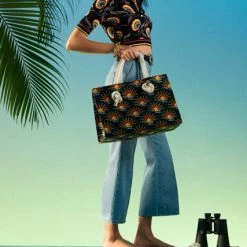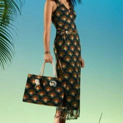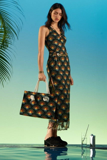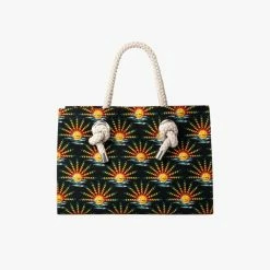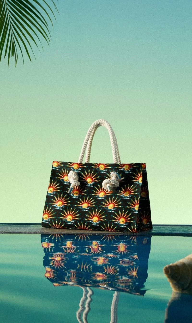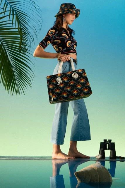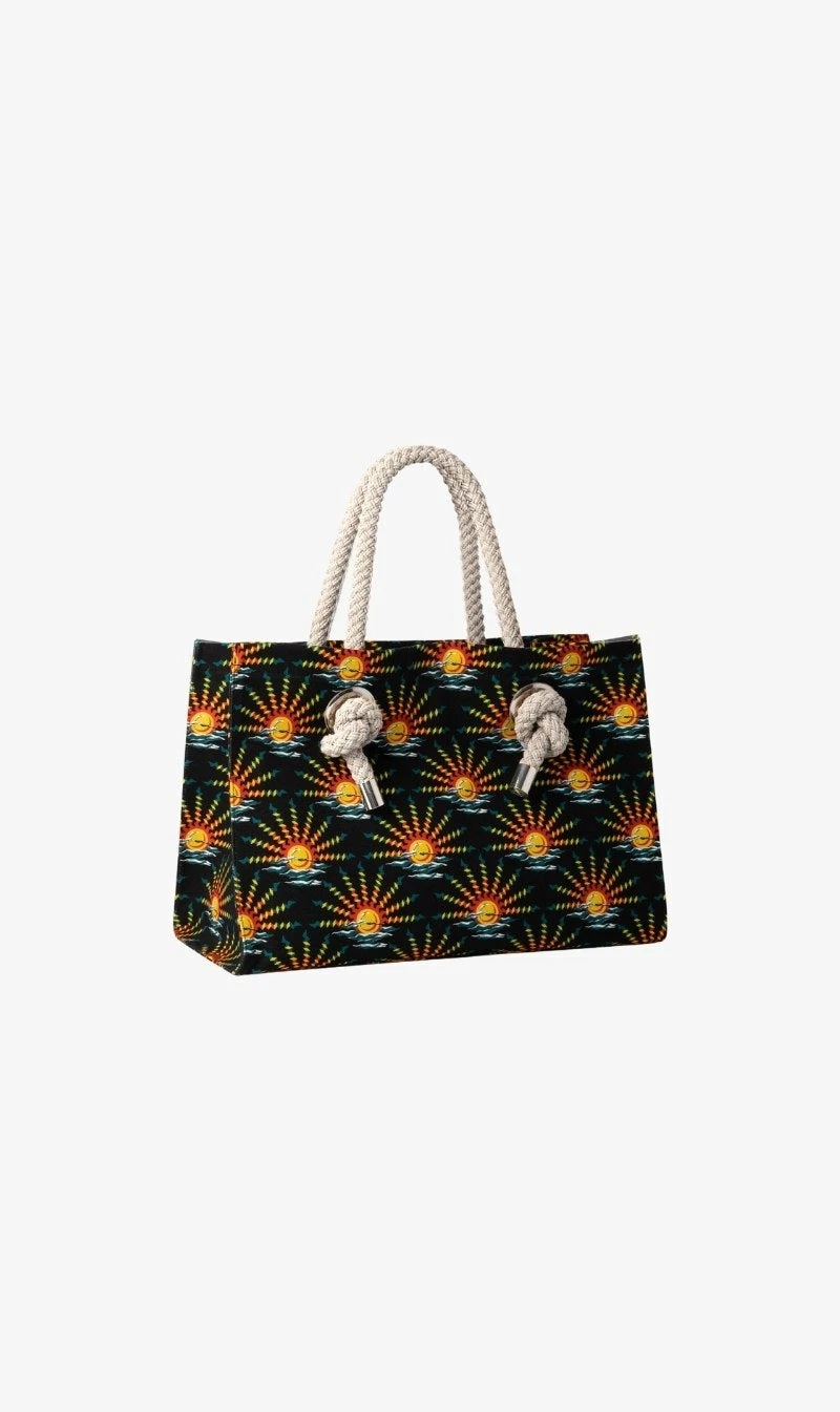 Paco Rabanne’s Sunrise tote is crafted from sustainable jacquard canvas showcasing a colourful graphic from the AW22 ready-to-wear collection, suspended by oversized rope-knot top handles.