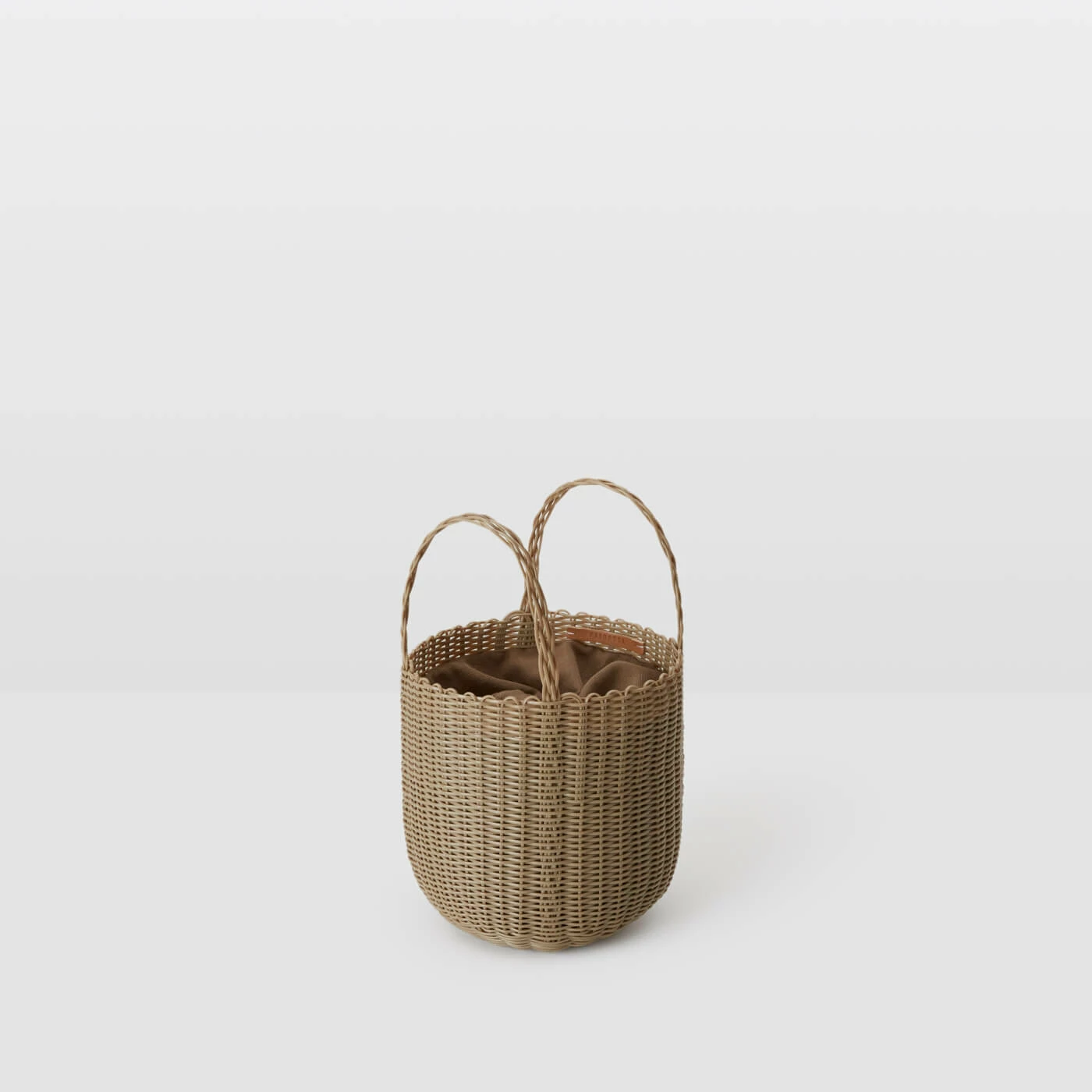 The Small Bucket Basket by Palosa is the ideal companion for the day, and the perfect accessory to carry all your essentials during an elegant night out. A top-handle bag with a rounded silhouette the Bucket bag is entirely handwoven in Guatemala, incorporating recycled plastic; this material makes the product light, minimalist and extremely durable.
