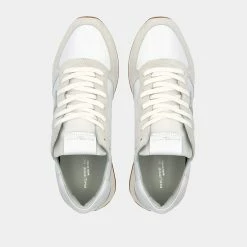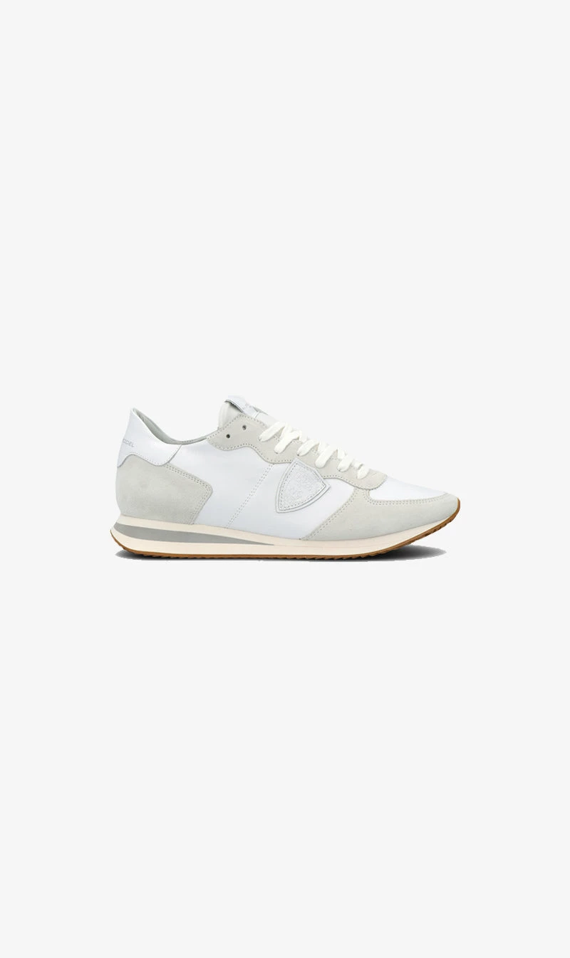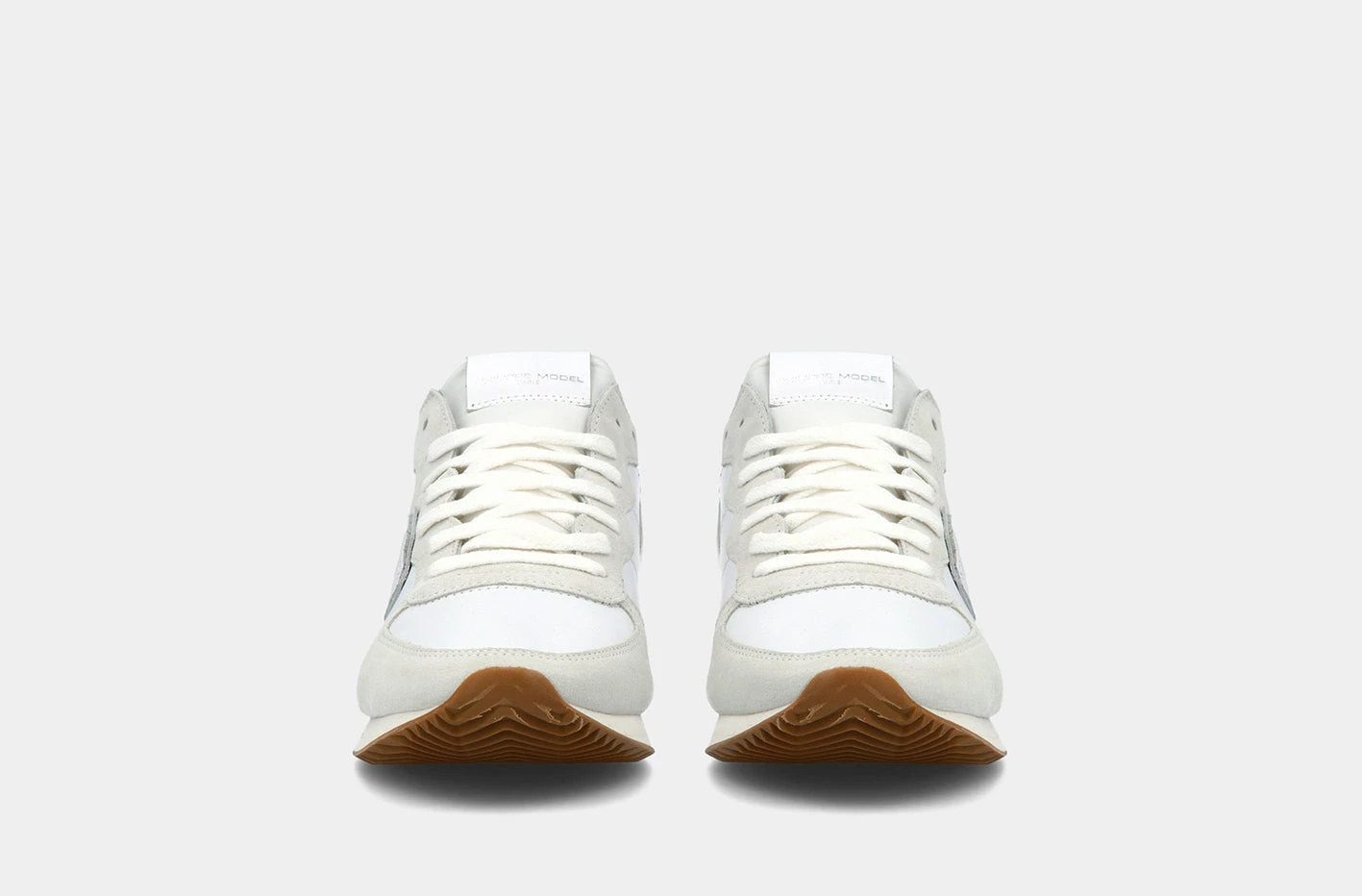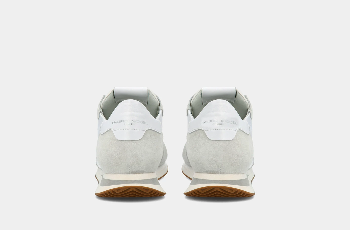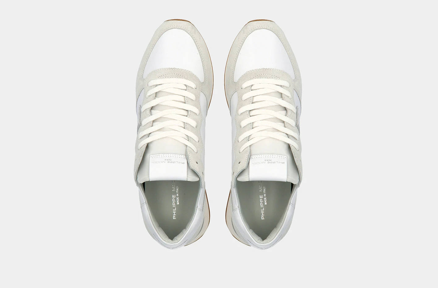 The Philippe Model Mens Trpx Low in Veau Blanc. One of the brand’s iconic models and characterised by a sinuous sole, TRPX is in line with new running trends. The upper is made from calfskin and suede. The laces are white and waxed. The sole is characterised by a handmade microporous EVA “colour block” and is 3 cm high.