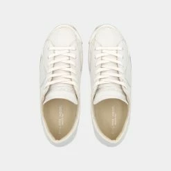 The Philippe Model Prsx Low in Basic Blanc. The idea of “lived-in” as a synonym for craftsmanship can be seen clearly in the PRSX, thanks to unique, patented foxing tape that creates a purposefully imperfect sole. The shield on the side of the shoe features the coat of arms of the City of Paris, where Philippe Model launched its brand. The upper is made from washed goatskin with a vintage used effect. The laces are butter-coloured with a worn effect. The sole, 2.5 cm high, is made from vintage effect brushed rubber. Philippe Model Paris uses Italian materials and leather. We call it “made with care in Italy”.