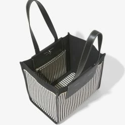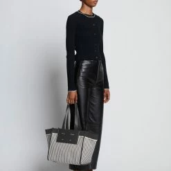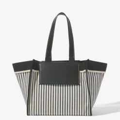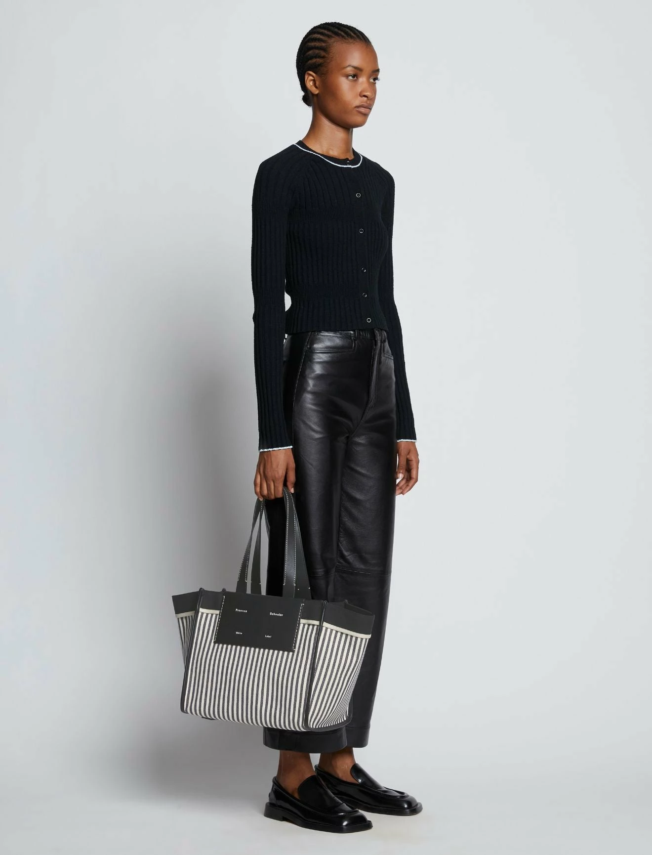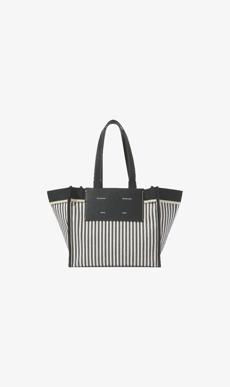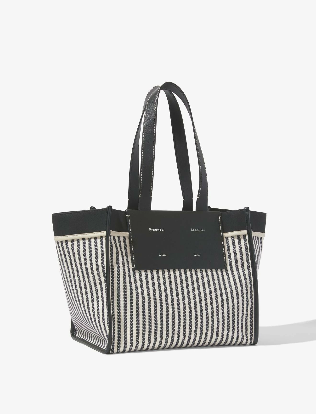 The Proenza Schouler Large Morris Two Tone Stripe Tote is cut to an unstructured, boxy silhouette with two black leather top handles and a logo-debossed patch at the front with contrast white topstitching. Decorative leather trims. Open top with a turn-lock closure. Unlined interior with a removable base and an attached zip pouch. Silver-tone metal hardware. 58% polyester, 42% cotton.