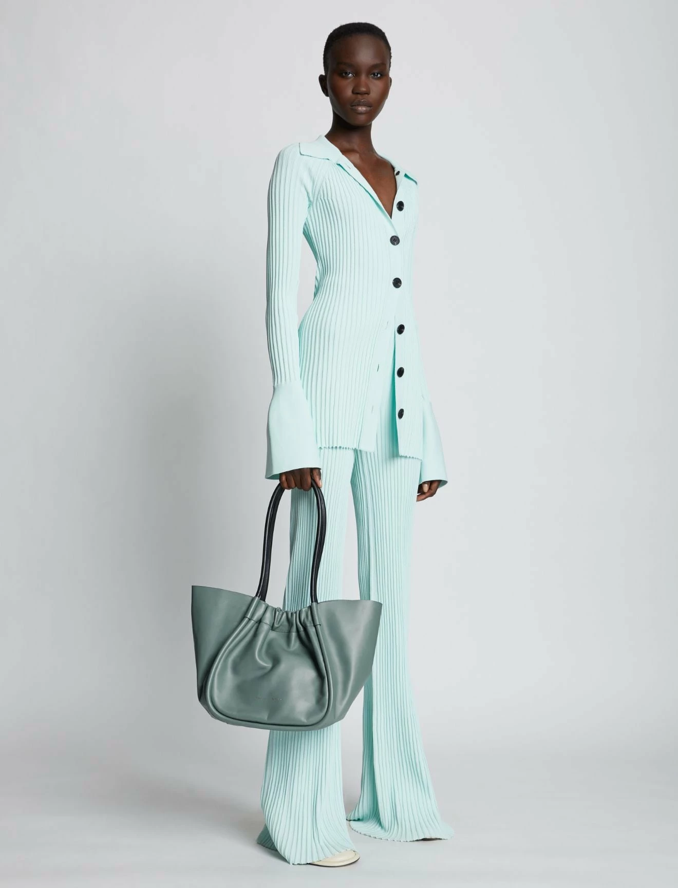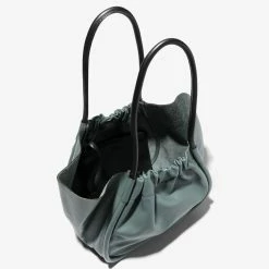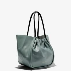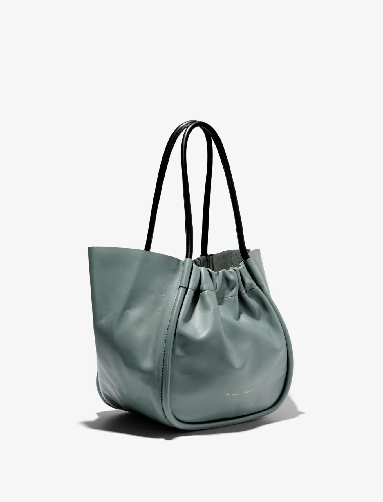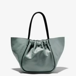 The Proenza Schouler Large Ruched Tote in Orion Blue is designed with a soft, unstructured silhouette, the L Ruched Tote in Orion blue features contrasting black handles and an open ruched top with magnetic closure. Finished with an unlined interior and attached leather zip pouch. Signature gold-tone foil logo stamp. Calf leather. Made in Italy.
