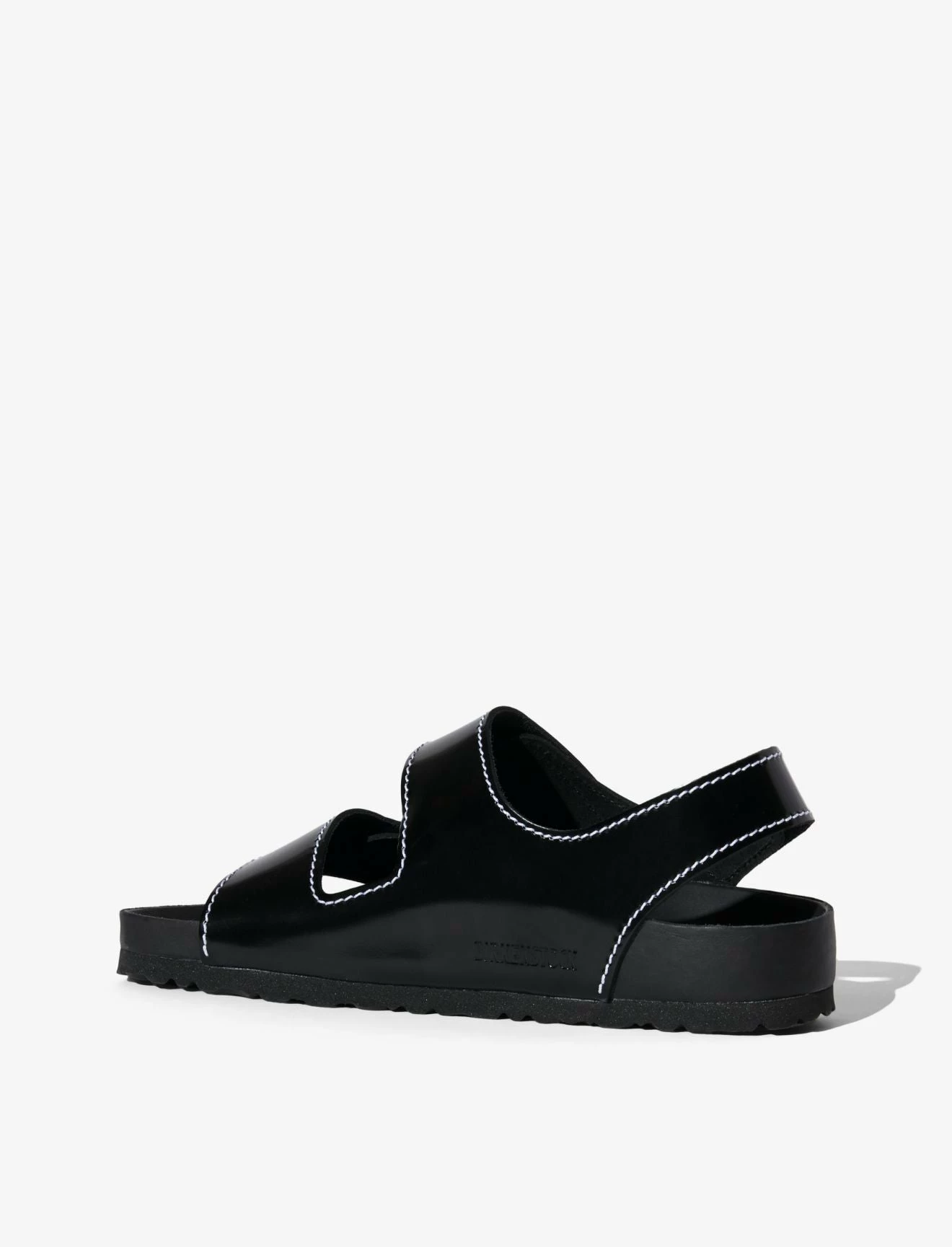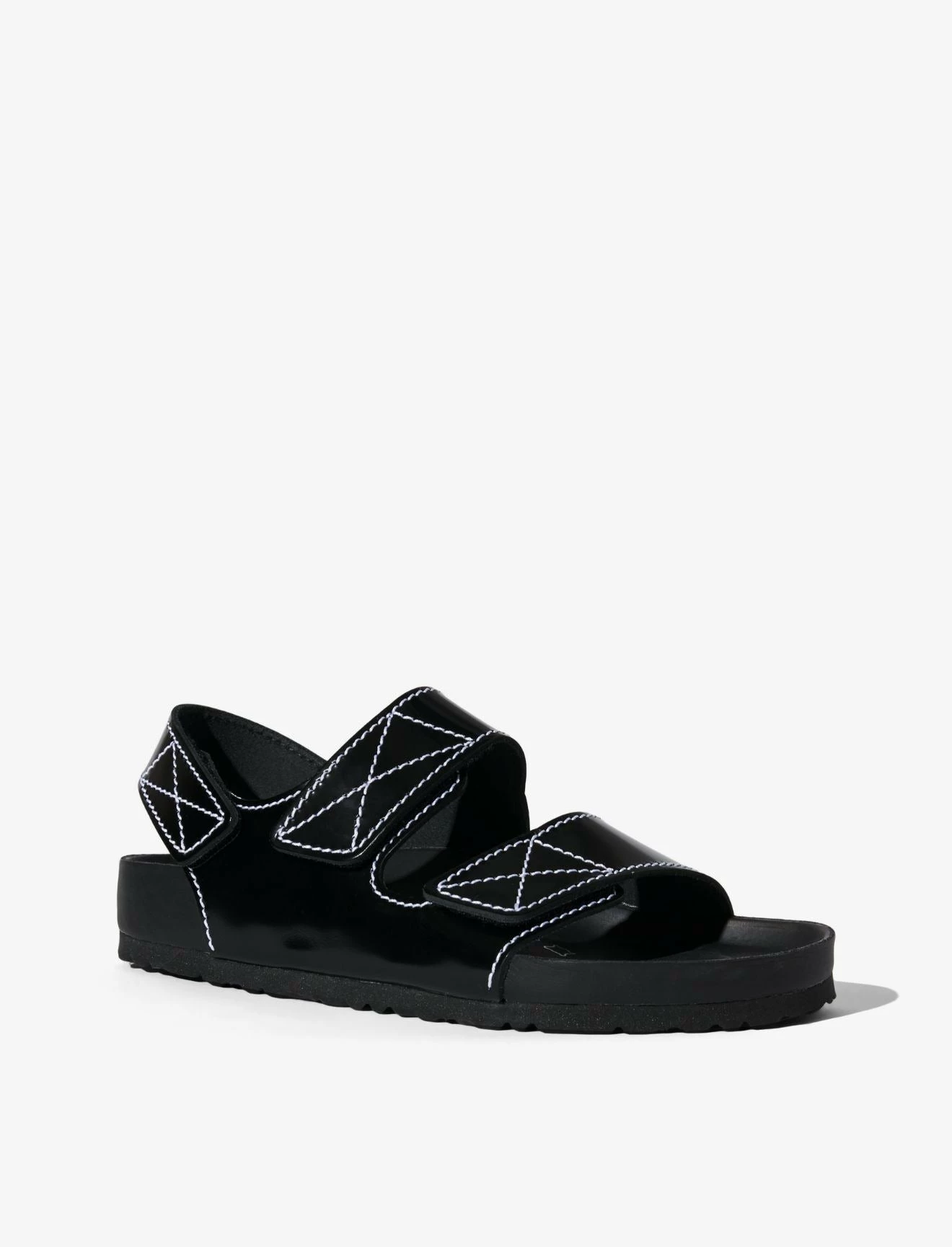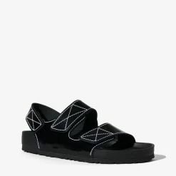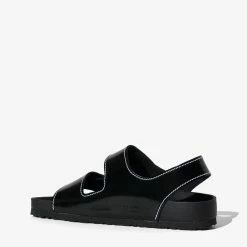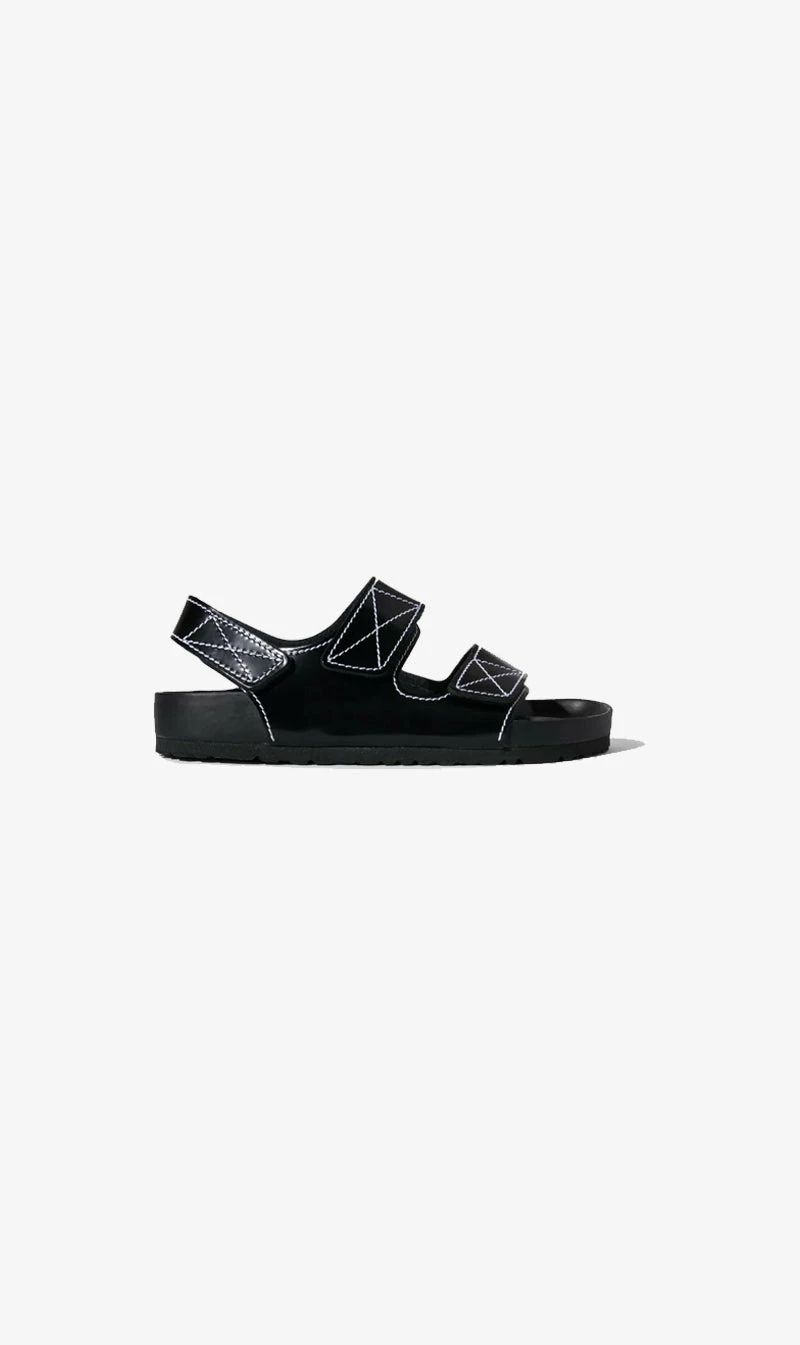 Made in collaboration with Birkenstock, the classic Milano three-strap sandals are reimagined in black specchio leather with contrast white topstitching. Designed with hook-and-loop fastened straps and a moulded cork footbed covered in Nappa leather.