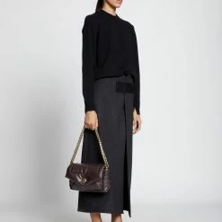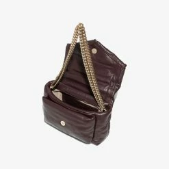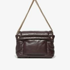 The Proenza Schouler PS Harris Bag in Chocolate Plum lambskin leather is crafted to a rectangular shape with softly rounded edges and comes cushioned with soft down. Features a gold-tone metal double-chain shoulder strap that can be extended and styled across the body. Interior pocket at the front and an envelope top flap that fasten with separate snap-button closures. Suede lining with one slip pocket.