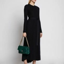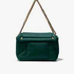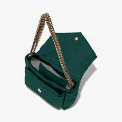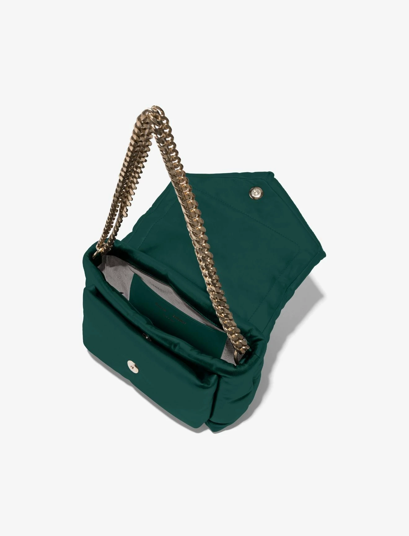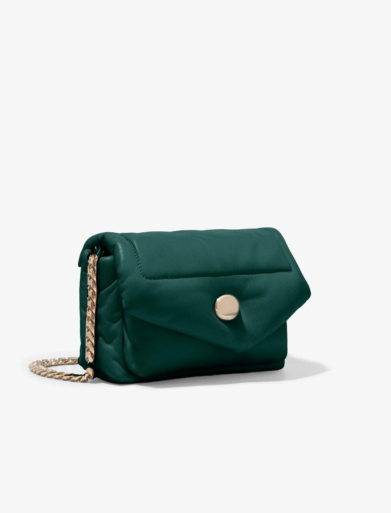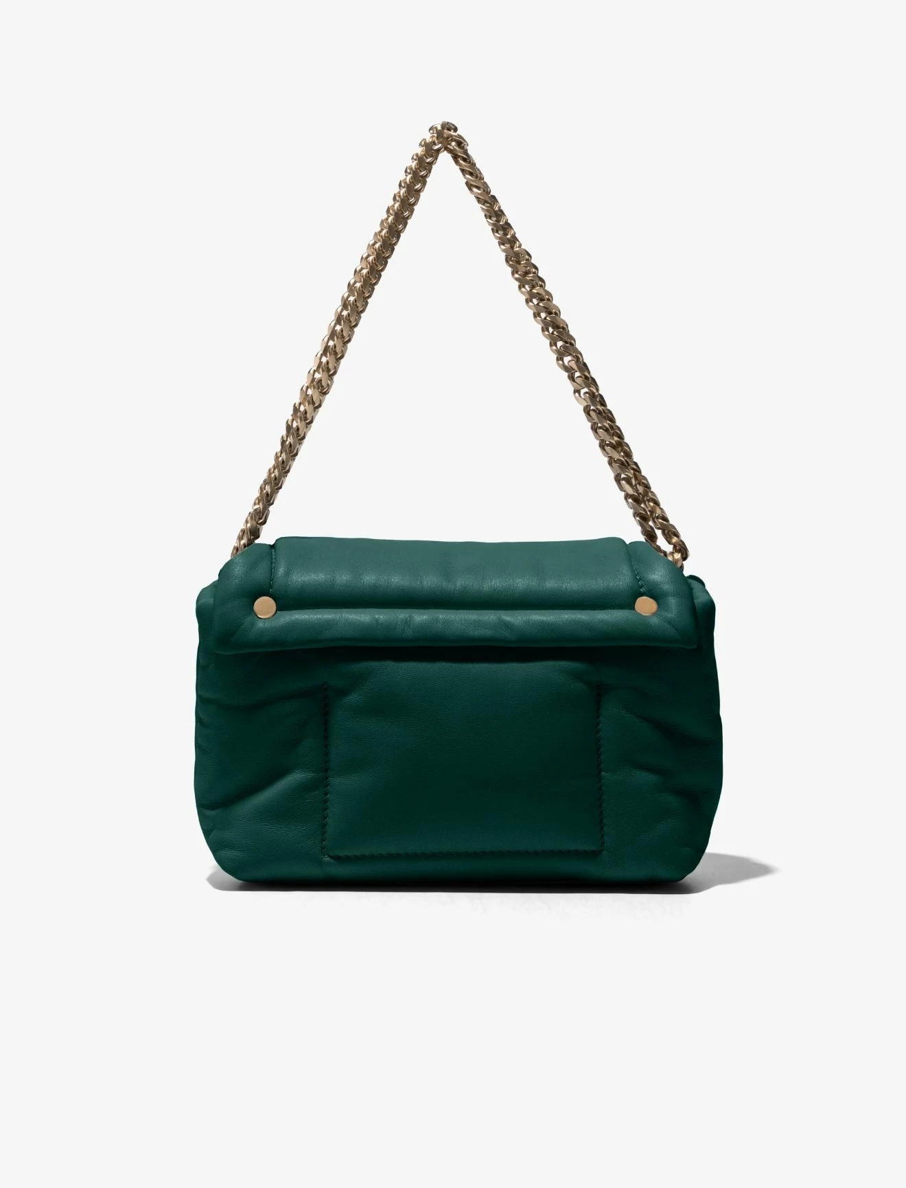 The Proenza Schouler PS Harris Bag in Dark Green lambskin leather is crafted to a rectangular shape with softly rounded edges and comes cushioned with soft down. Features a gold-tone metal double-chain shoulder strap that can be extended and styled across the body. Interior pocket at the front and an envelope top flap that fasten with separate snap-button closures. Suede lining with one slip pocket.