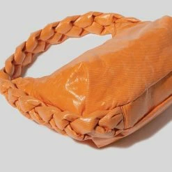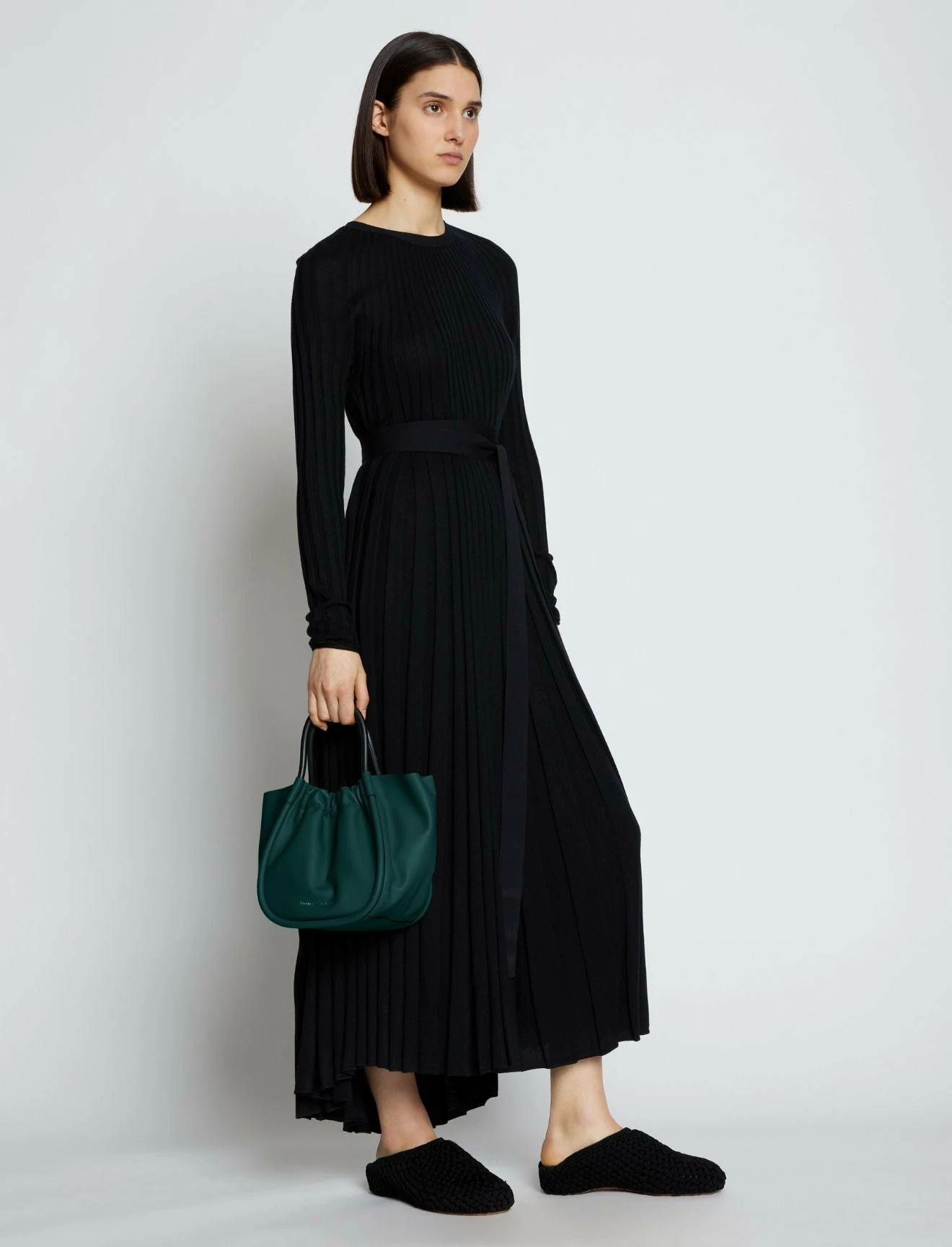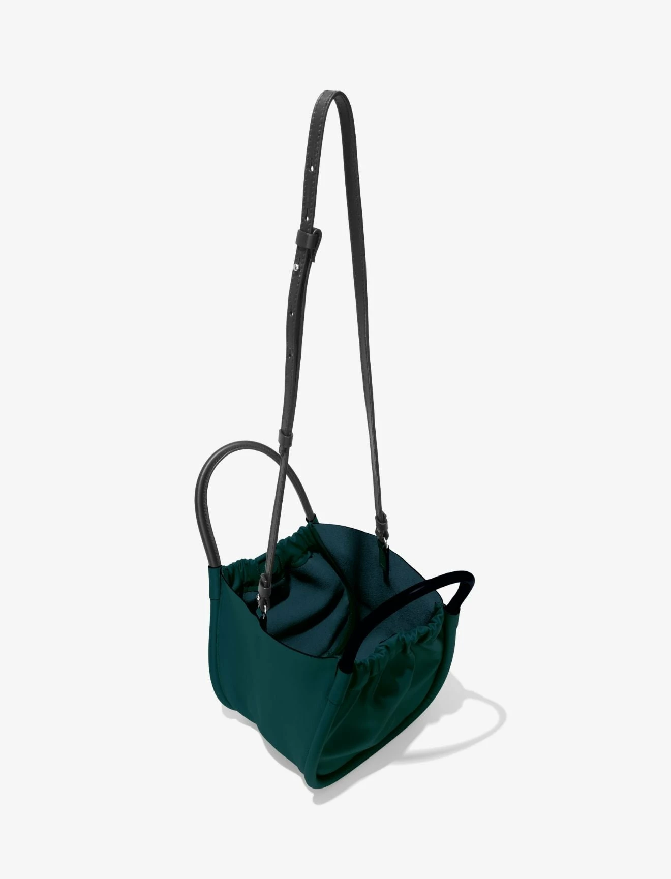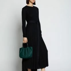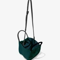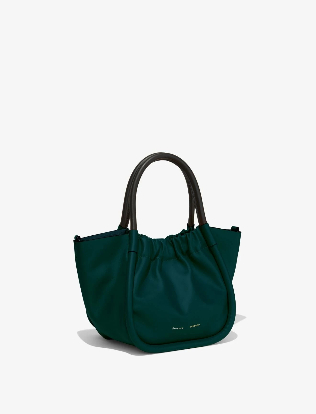 The Proenza Shcouler Small Ruched Crossbody Tote in green calf leather is designed with a soft, unstructured silhouette, a ruched open top and a magnetic closure. Features contrasting black structured top handles and a removable, adjustable shoulder strap. Finished with an unlined interior. Silver-tone metal hardware. Signature silver and gold-tone logo stamp at the front.