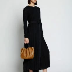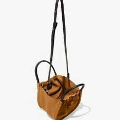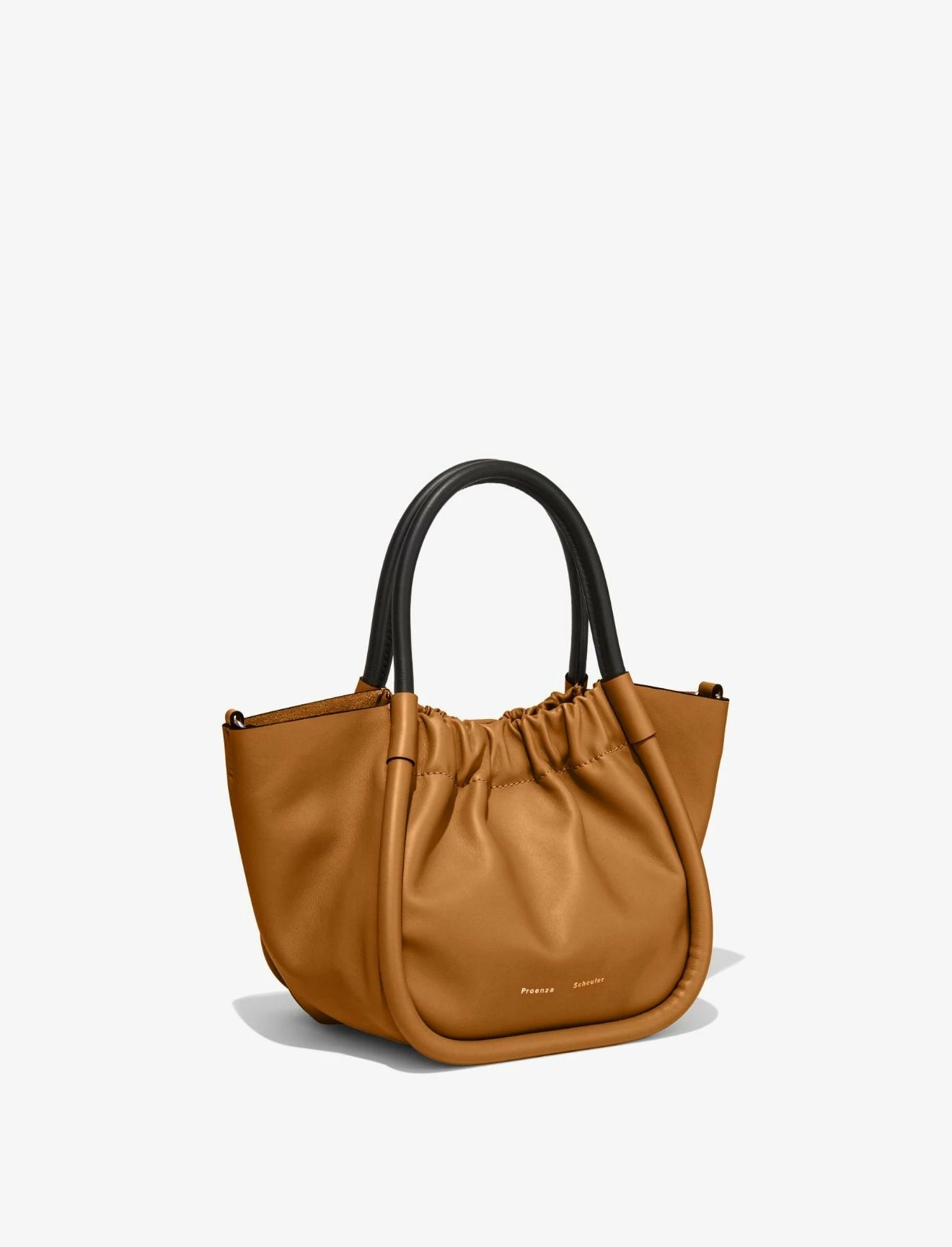 The Proenza Shcouler Small Ruched Crossbody Tote in brown calf leather is designed with a soft, unstructured silhouette, a ruched open top and a magnetic closure. Features contrasting black structured top handles and a removable, adjustable shoulder strap. Finished with an unlined interior. Silver-tone metal hardware. Signature silver and gold-tone logo stamp at the front.