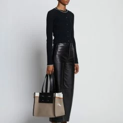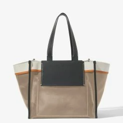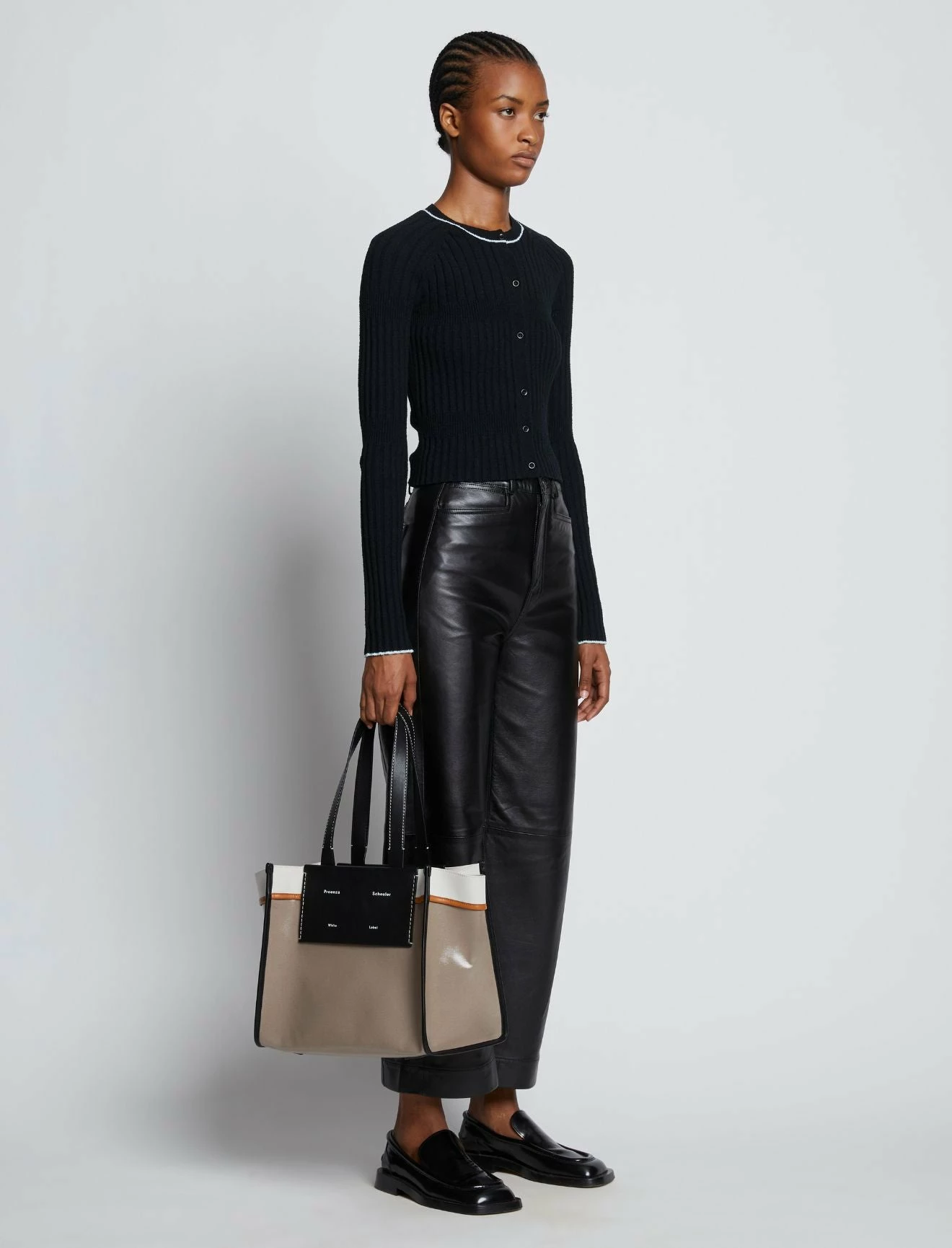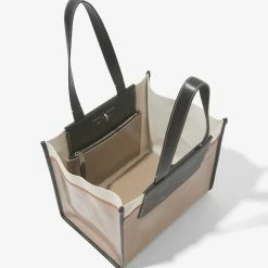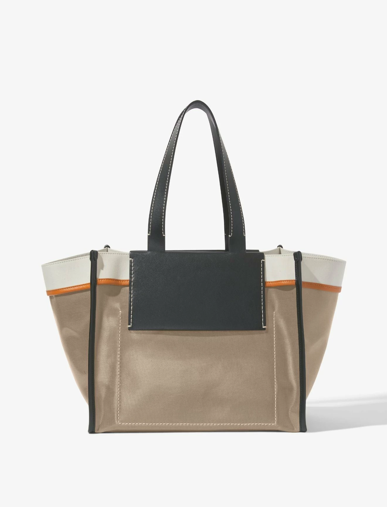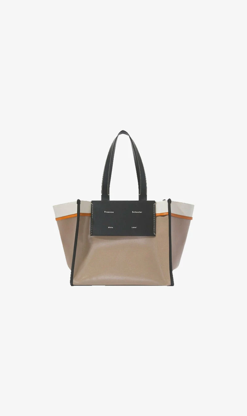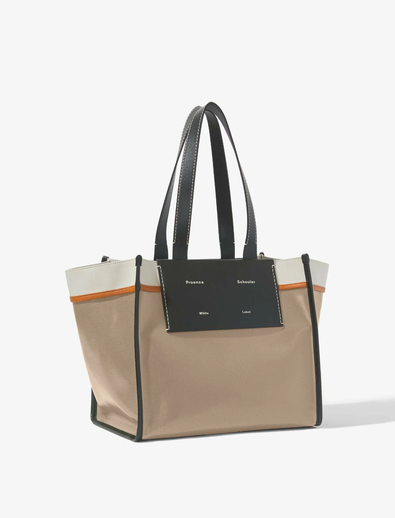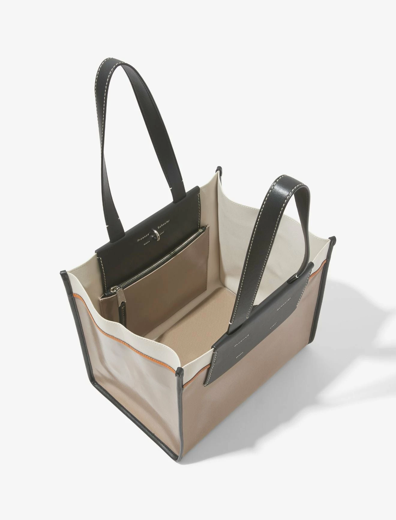 The Proenza Schouler Large Morris Coated Canvas Tote is cut from taupe coated canvas to an unstructured, boxy silhouette with a contrast stripe at the top. Two black leather top handles and a logo-debossed patch at the front with contrast white topstitching. Decorative leather trims. Open top with a turn-lock closure. Unlined interior with a removable base and an attached zip pouch. Silver-tone metal hardware. 60% cotton, 40% PVC.