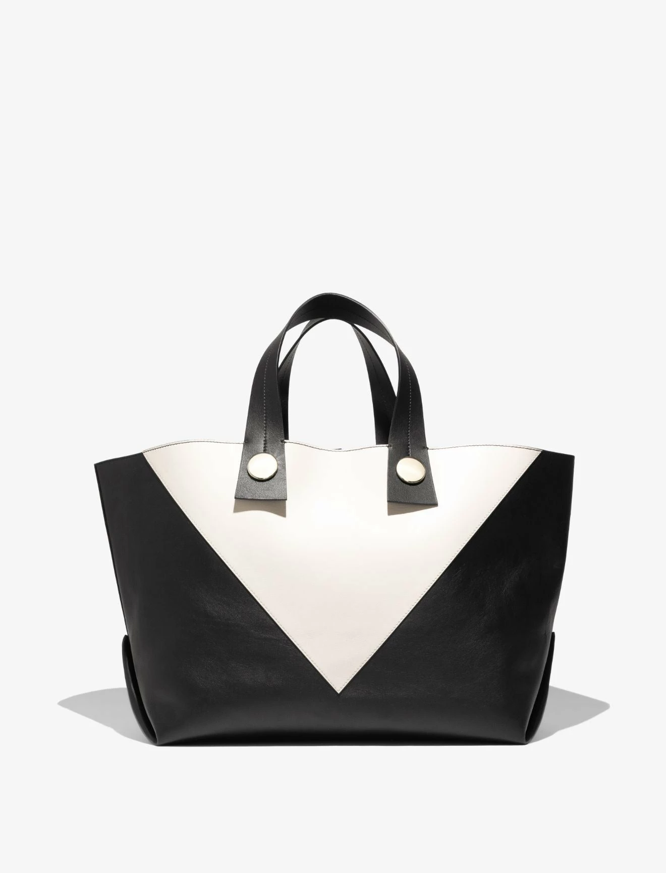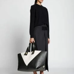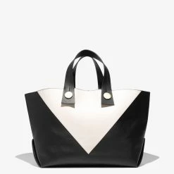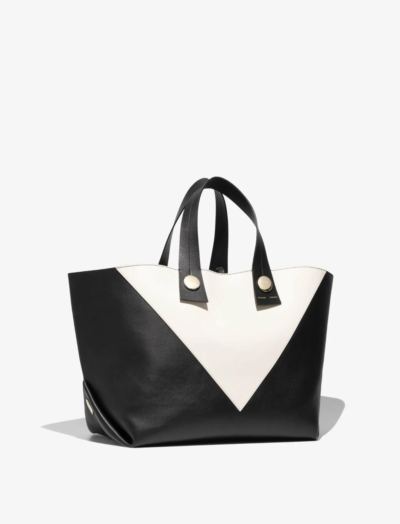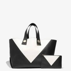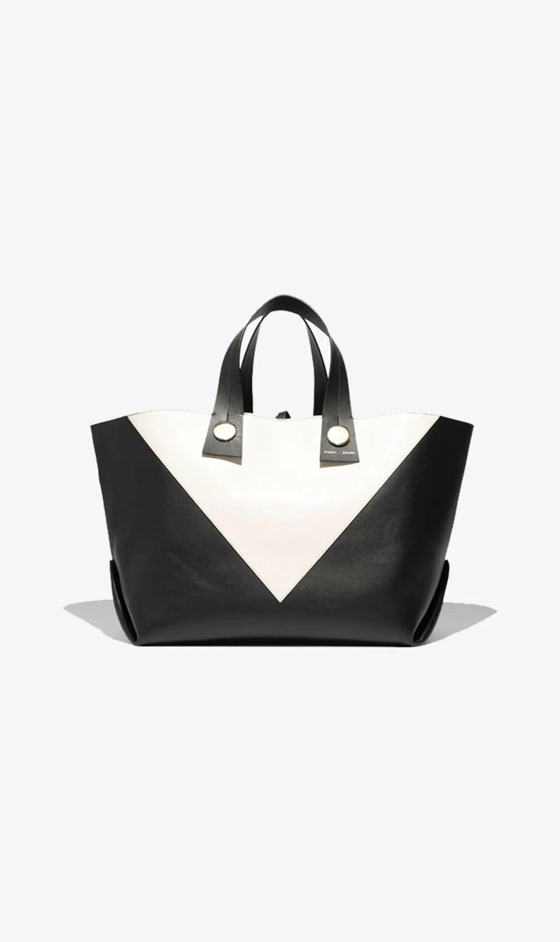 The Proenza Schouler XL Tobo Tote in smooth black and white leather is crafted to a structured, oversized silhouette with a contrast triangular panel at the front. Features exaggerated leather shoulder straps with visible topstitching, polished metal hardware and a signature gold-tone logo stamp. Open top with a self-tie closure. Interior leather coin pouch.