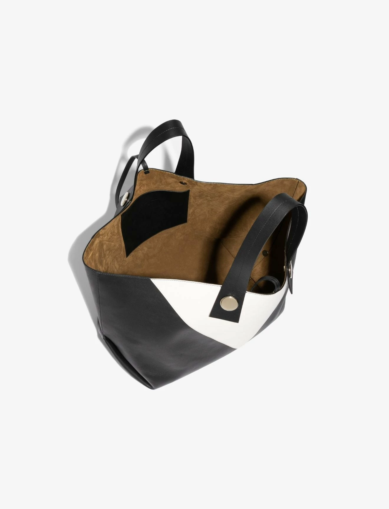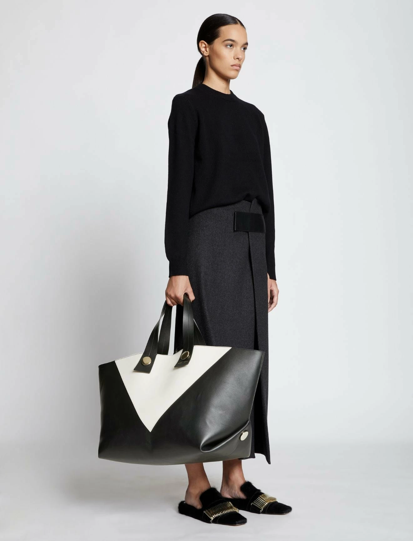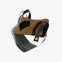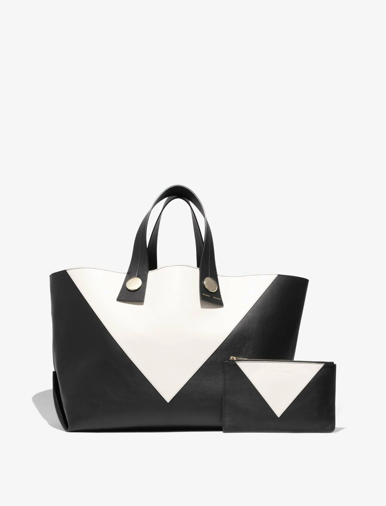 The Proenza Schouler XL Tobo Tote in smooth black and white leather is crafted to a structured, oversized silhouette with a contrast triangular panel at the front. Features exaggerated leather shoulder straps with visible topstitching, polished metal hardware and a signature gold-tone logo stamp. Open top with a self-tie closure. Interior leather coin pouch.