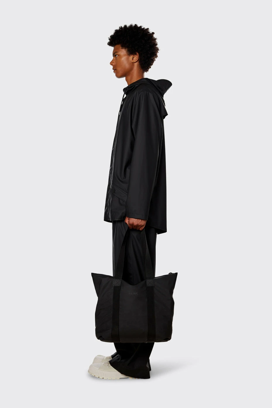- Tote Bag Rush is cut in Rains’ signature waterproof PU fabric, engineered for carrying strength, durability, and a smooth feel.