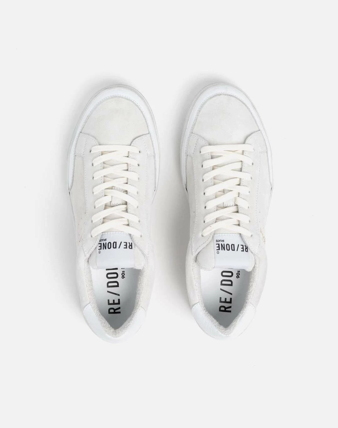 The Re/Done Skate Shoe in Whiet Suede. A 90s Skate Shoe, inspired by the decade’s most iconic subculture, finished in all over suede with a vintage wash.
