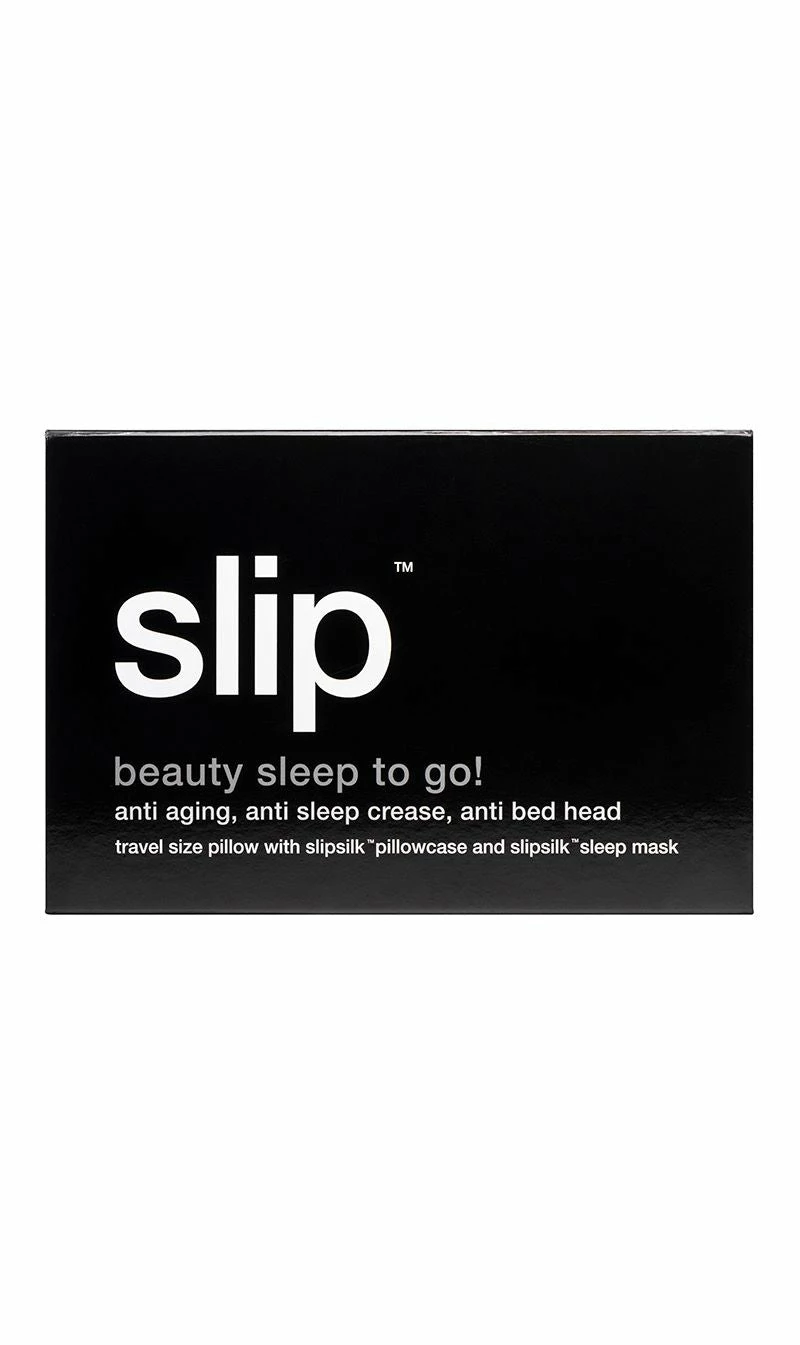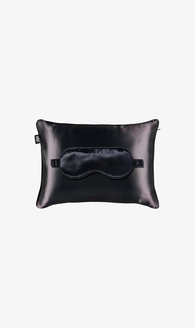 The Slip Beauty Sleep Travel Kit in Black. Slipsilkâ„¢ is specially-commissioned and made to exacting standards, developed and refined over ten years to provide the ultimate combination of shine, thickness, softness and durability. Using the the highest grade (6A) long fibre mulberry silk, with a thickness of 22 momme and enforce the strictest quality guidelines, including non-toxic dyes.