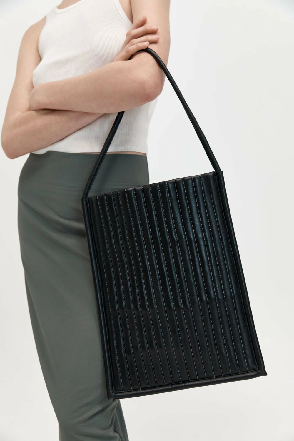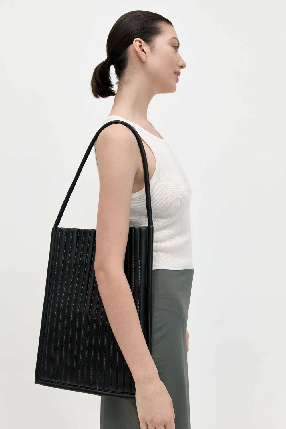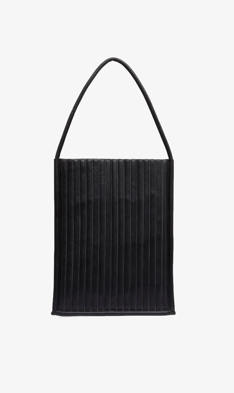 A buttery soft and cloud-like everyday tote, the Quilted Pinstripe Bag by St Agni features a puffy quilted leather body with contrast vertical stitching and a structured silhouette, a piped leather handle, magnet closure and cotton lining. Designed to be slung on the shoulder, the Quilted Pinstripe Bag was designed for high-rotation use.