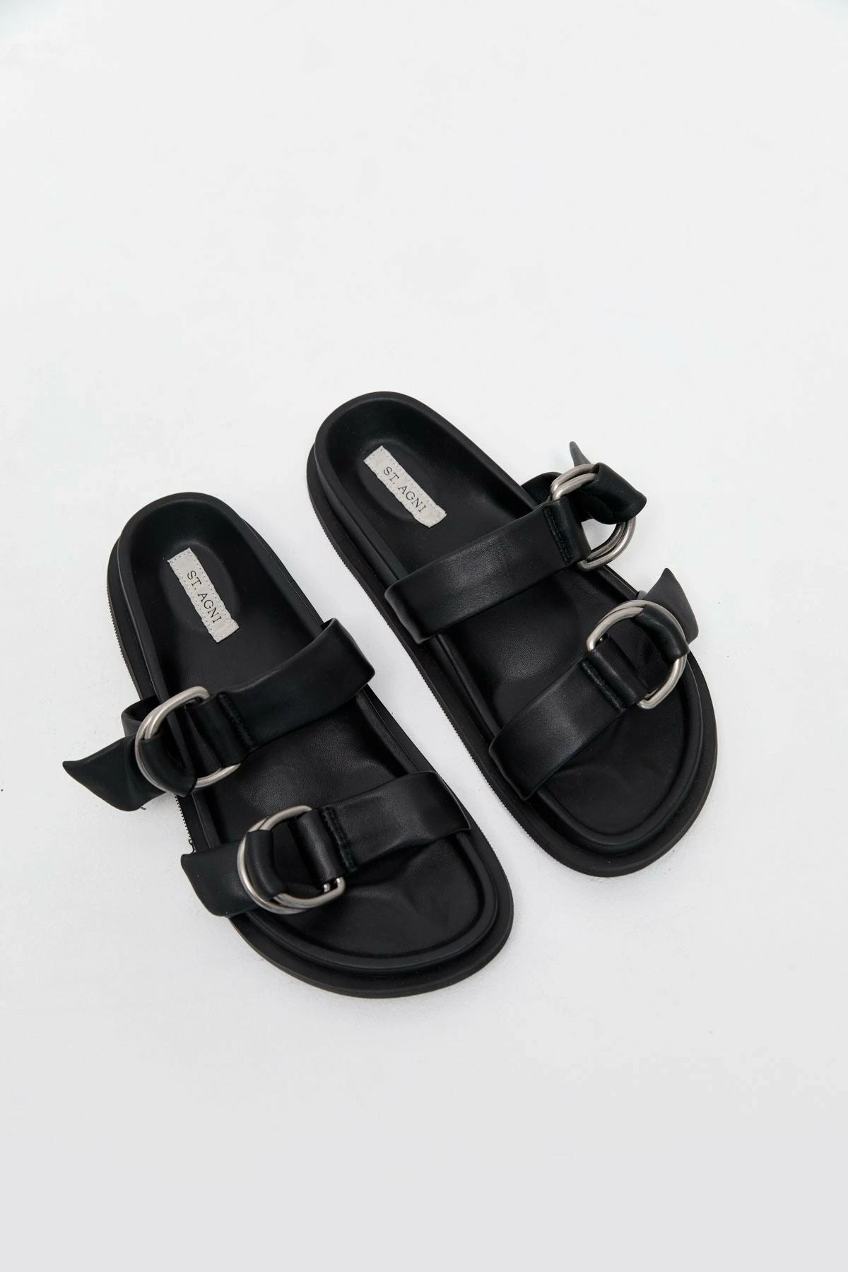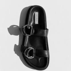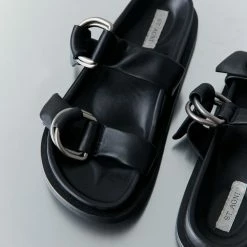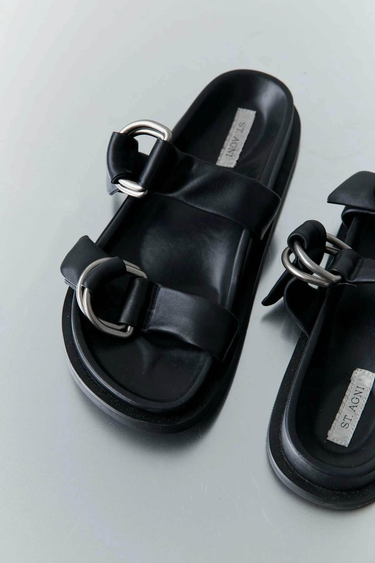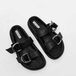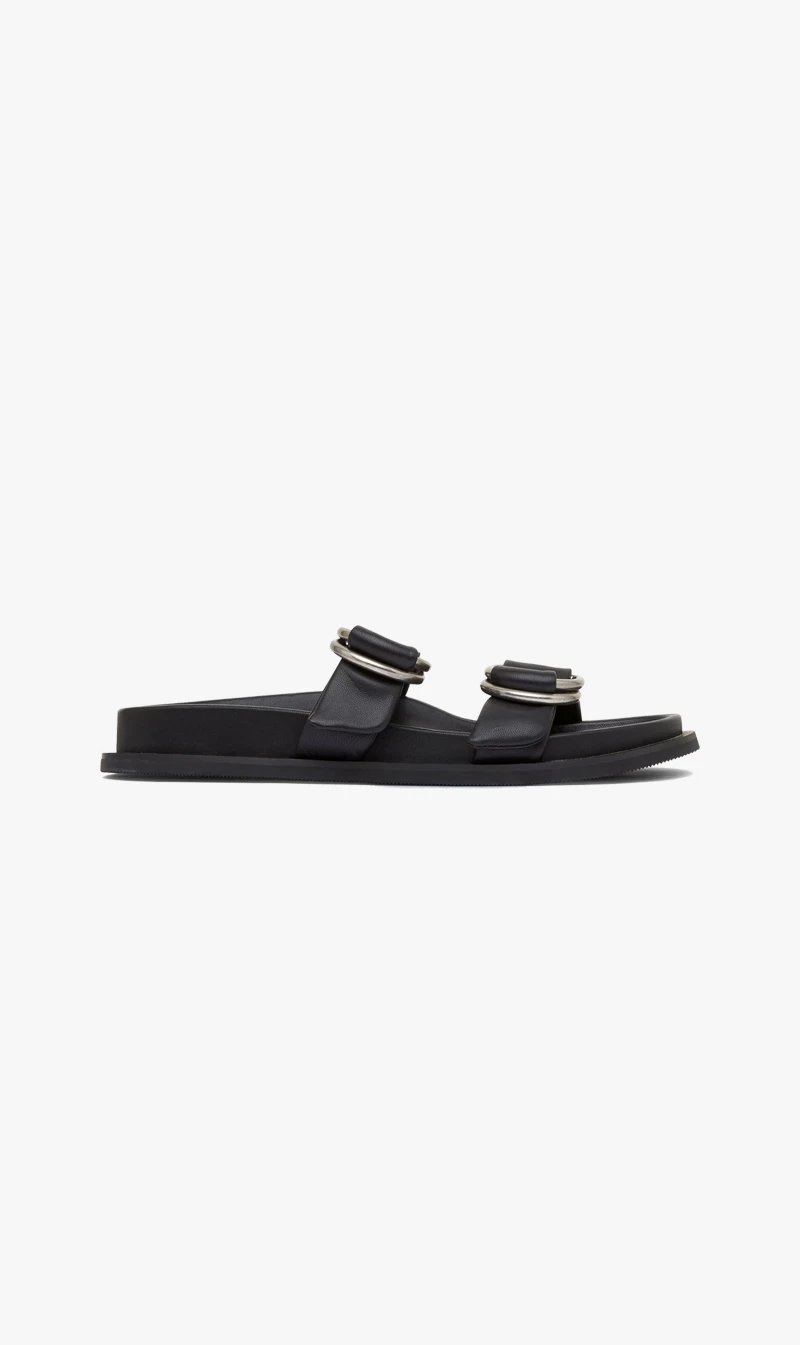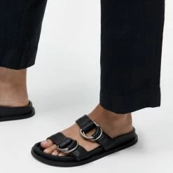 The St. Agni Ring Detail Slide in Black is a modern take on a classic moulded slide. The Ring Detail Slide boasts a thick rubber sole, two adjustable D-Ring leather straps, and a moulded footbed for wear-all-day comfort. A warm-weather staple, the Ring Detail Slide is a high-rotation favourite.