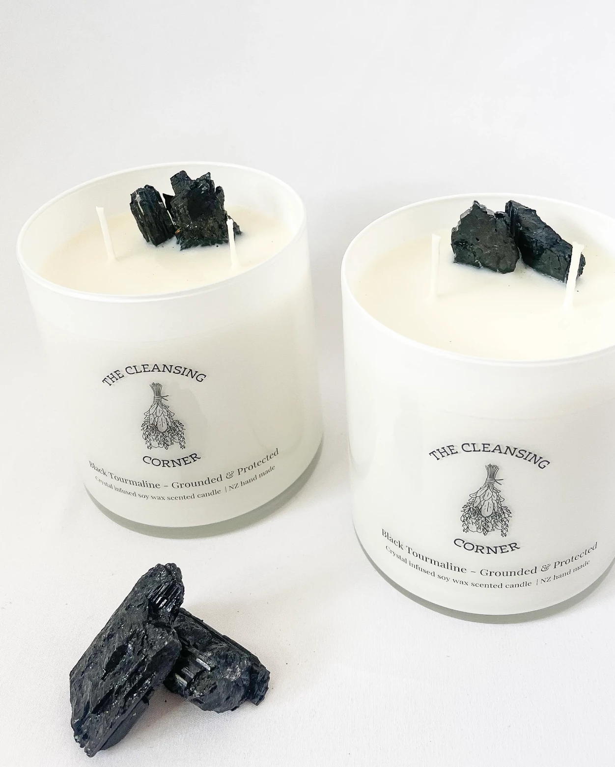 The Cleansing Corner Black Tourmaline Candle helps to create a shield around a person or room to prevent negative or unwelcome energies from entering. It is also grounding and helpful in balancing all of the chakras. The stone can even dissolve challenging energy and negative thought patterns, transmuting them into more beneficial energy and beliefs.