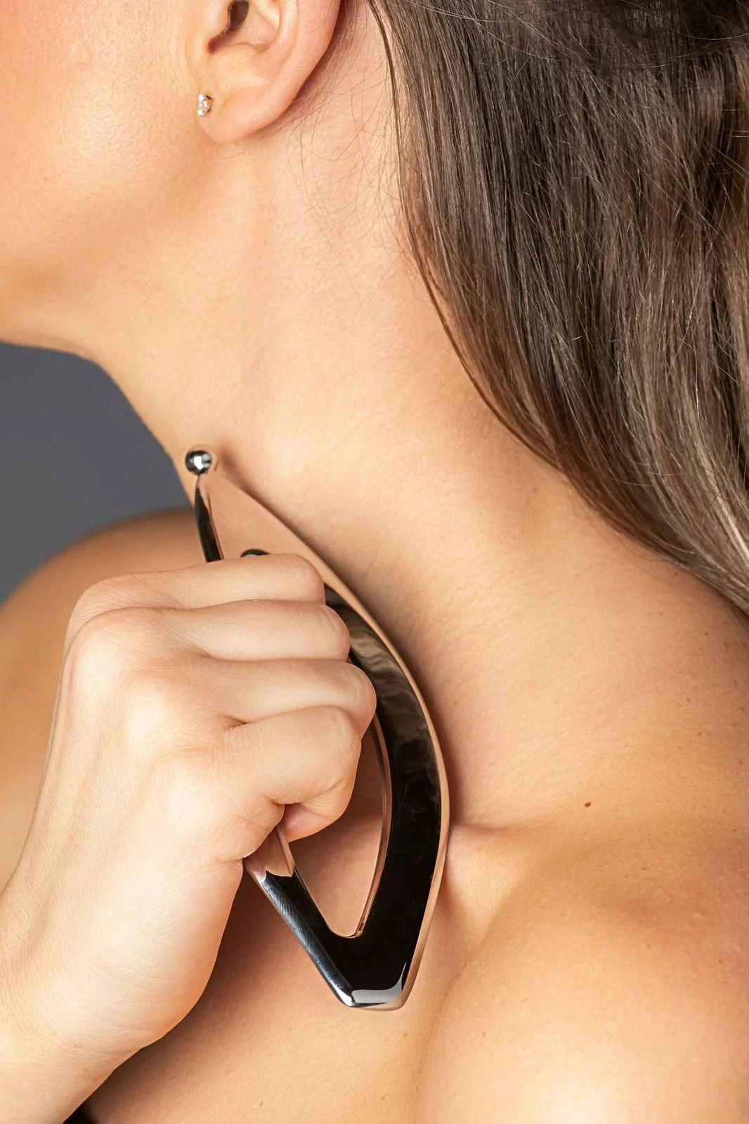 The Body Contour Massager from Tronque is an ultra-luxe stainless steel ergonomic designed body blade massage contour tool can be performed for use on both the body and the face. Relaxing tight muscles, stimulating lymphatic drainage, de-puffing and encouraging skincare to penetrate deeper.