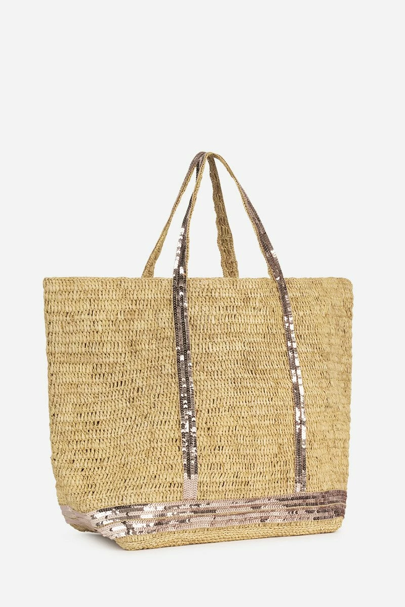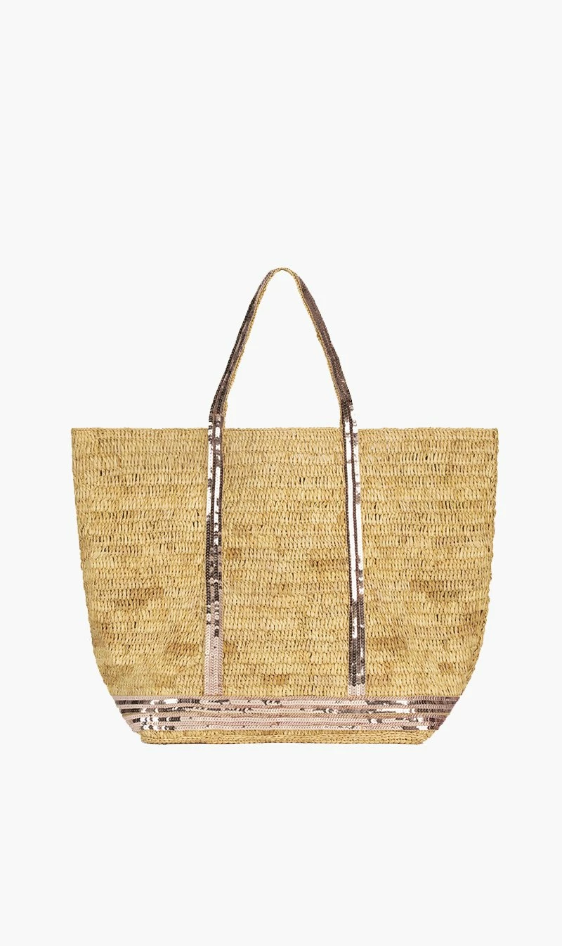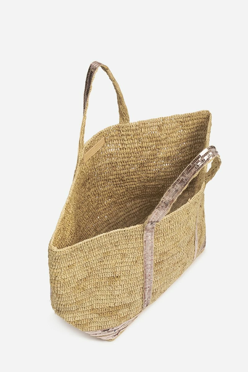The beautiful Vanessa Bruno Cabas Grand bag is a handmade raffia cabas tote bag topped off with sequins. This cabas tote bag can be carried by hand or on the shoulder. It is topped off with a label of natural vegetable leather hot stamped with “Le Cabas Vanessa Bruno made in Madagascar”. Resistant, this is the perfect beach bag.