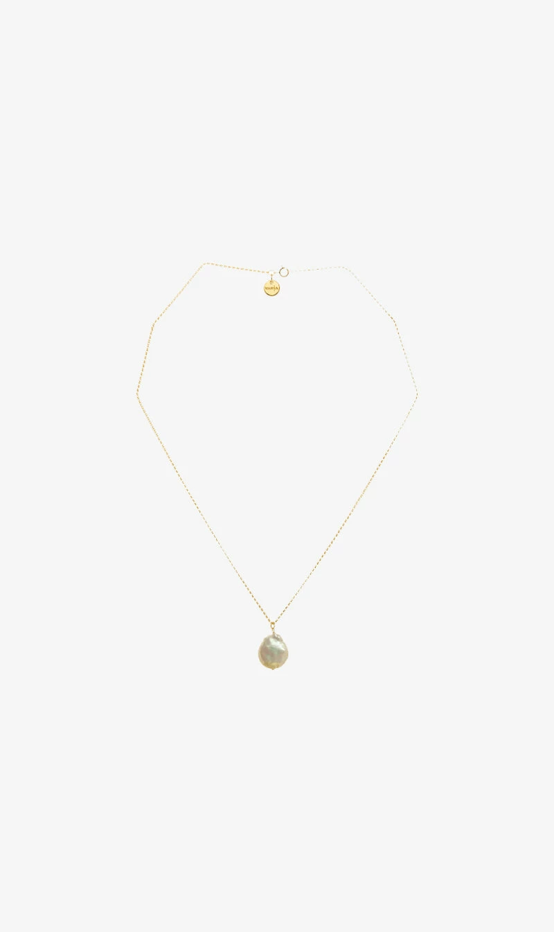 Crafted with 14ct Gold-filled classic rolo chain. This fine chain necklace features a Baroque Freshwater pearl drop as a pendant and measures 42cm long. It sits a short necklace on your décolletage.