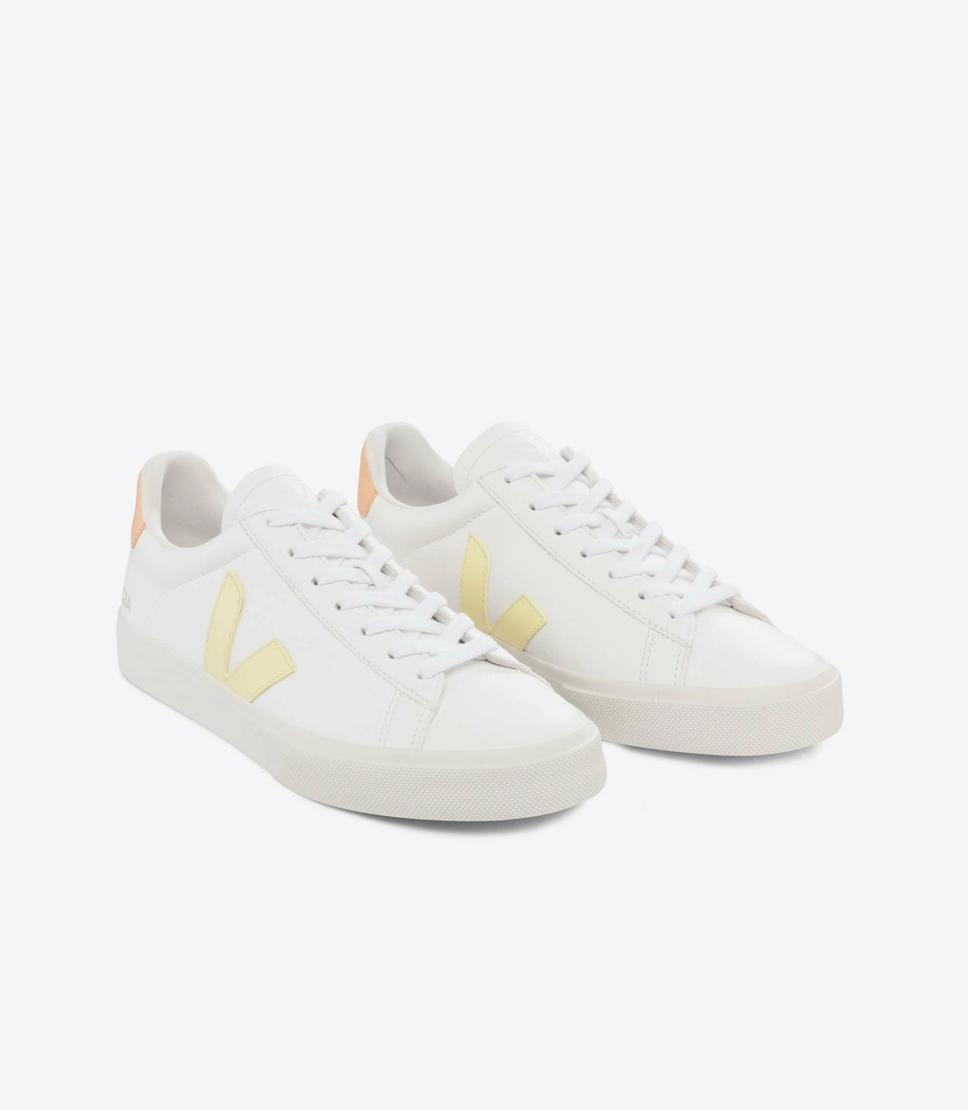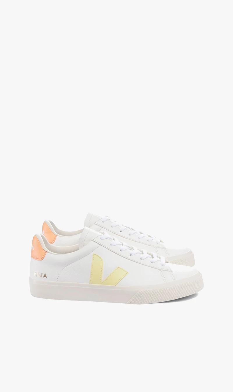The Veja Campo Chromefree in Extra White Sun Peach is the perfect sneaker to brighten any look. They are sustainably crafted with smooth and light bovine leather from farms in southern Brazil. These are the perfect versatile sneaker. Pair yours with anything from jeans, tailored pants or dresses.Â