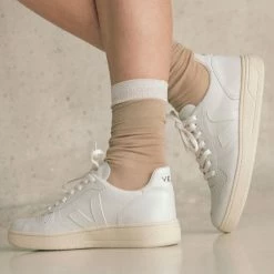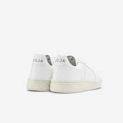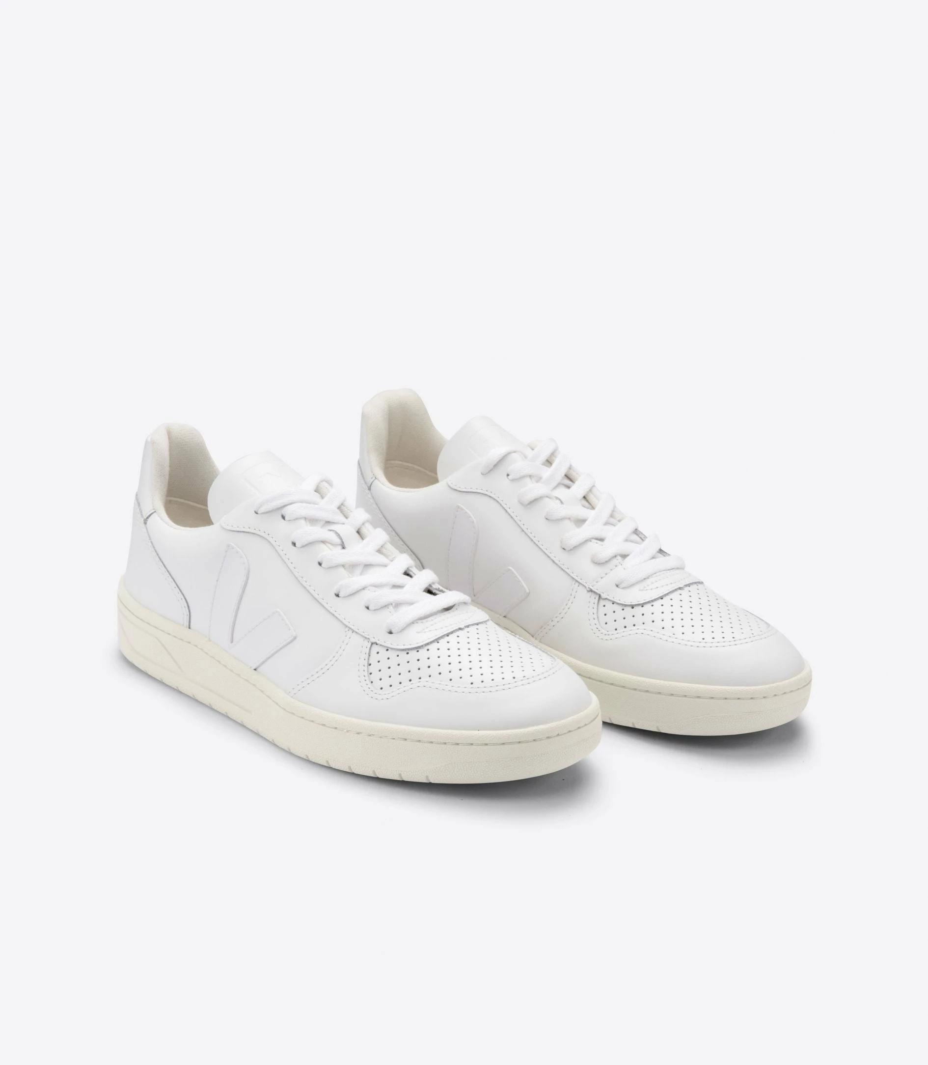The Veja V-10 Leather Sneakers in Extra White. The bovine leather comes from farms in Uruguay, a country known for its culture of animal husbandry and the quality of its leather. It is tanned in Brazil, respecting the REACH norms. Special attention is paid to water usage during the tanning process.