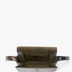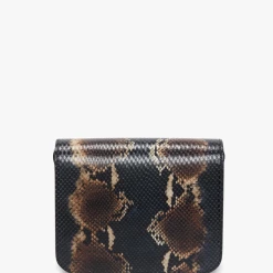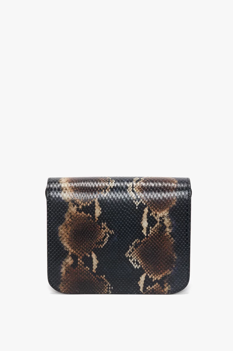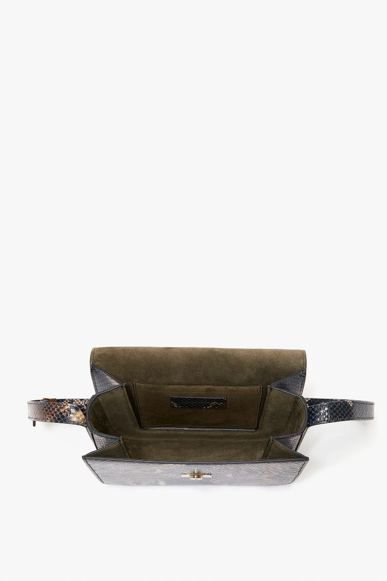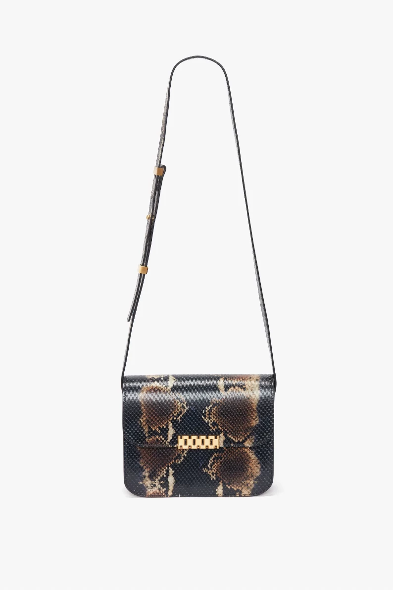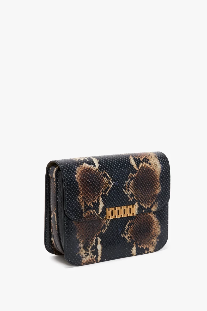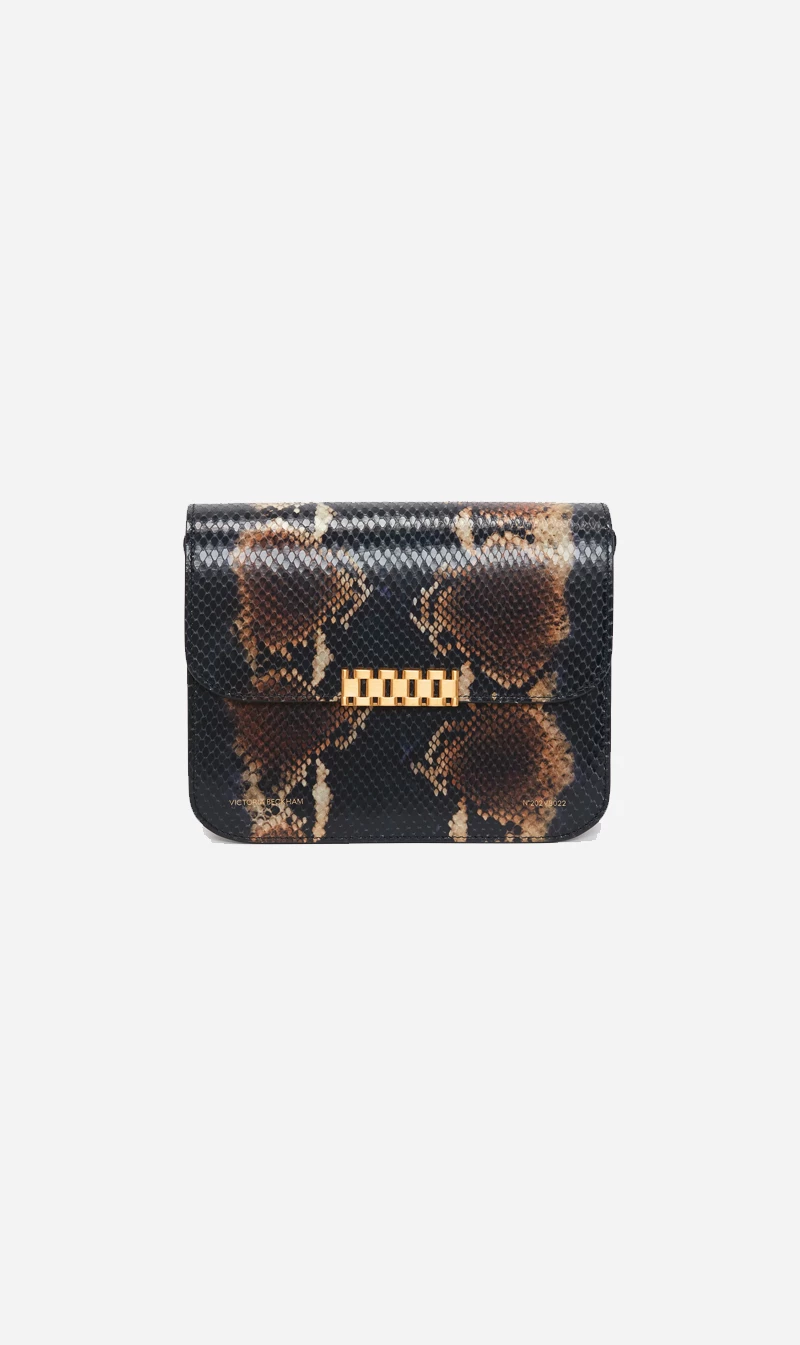 In a navy-brown snake print – a key motif of Victoria Beckham’s new season – the Eva Chain Shoulder Bag combines vintage references with modern design details. The gold-tone hardware clasp sits neatly against the softly structured envelope flap, and is finished with an adjustable contrast strap to be worn on the shoulder or crossbody. An additional front flap compartment ensures essentials are close to hand.