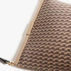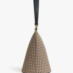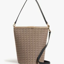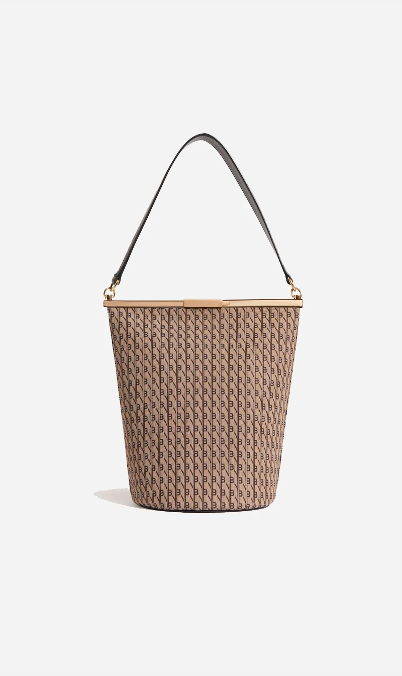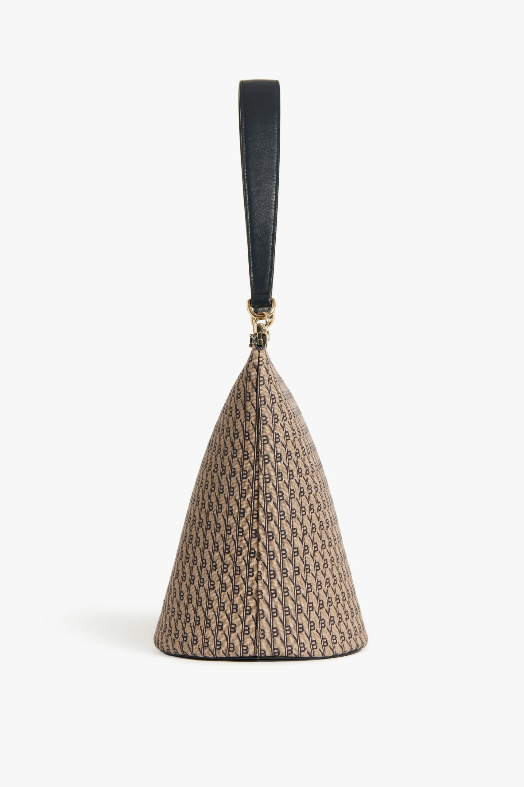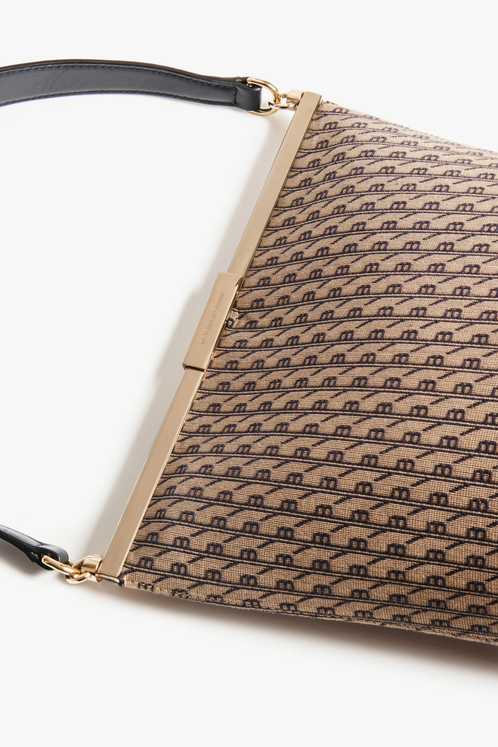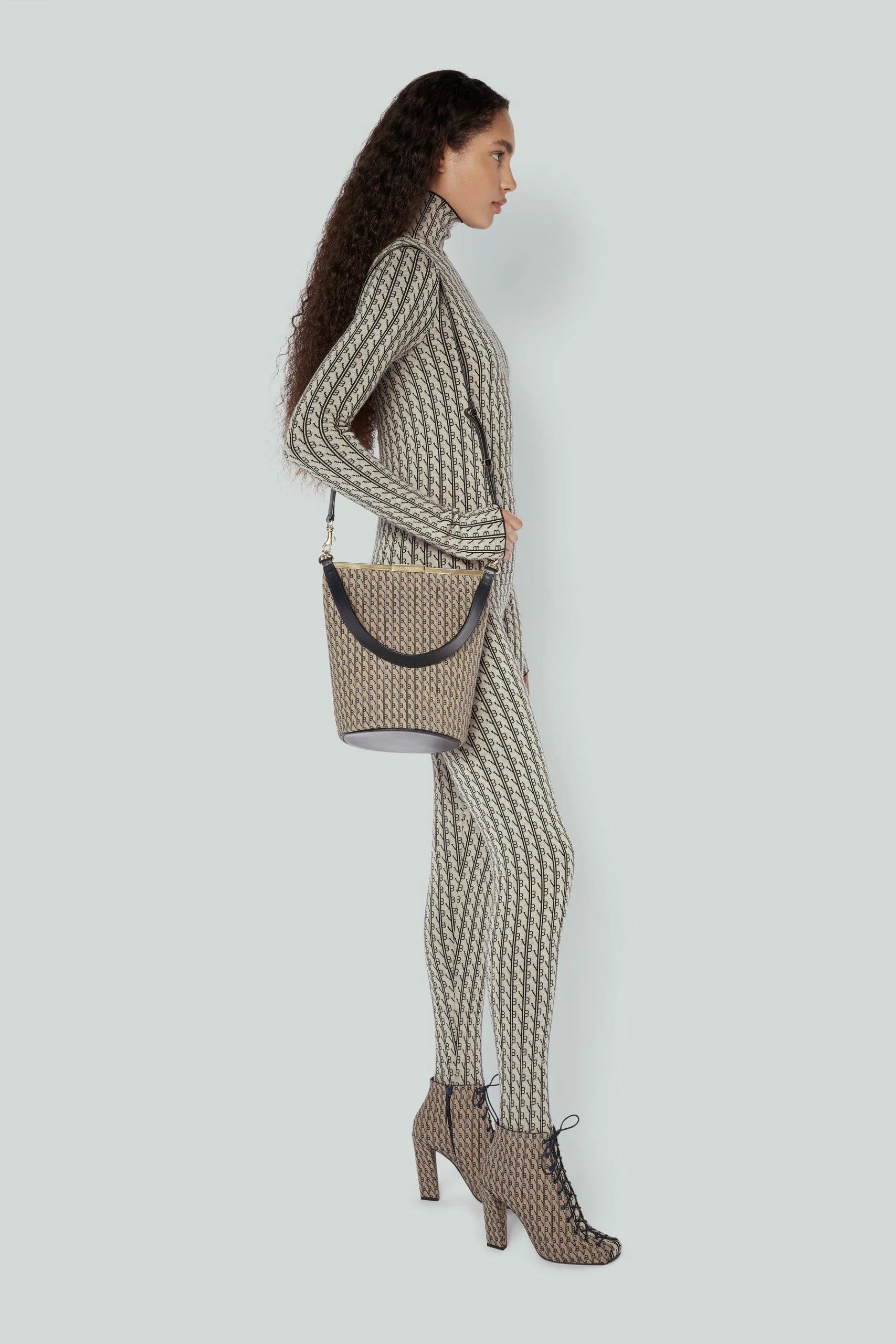 Inspired by heritage jacquards from the 60s and 70s, reimagined through a modern lens, this iteration of the Frame Bucket bag by Victoria Beckham brings the new VB house monogram jacquard to our leather goods launch. In an elegant navy and camel combination paired with signature gold-tone hardware, it’s designed to go with everything. The graphic frame fastening opens into a diamond shape which enhances the style’s architectural structure.