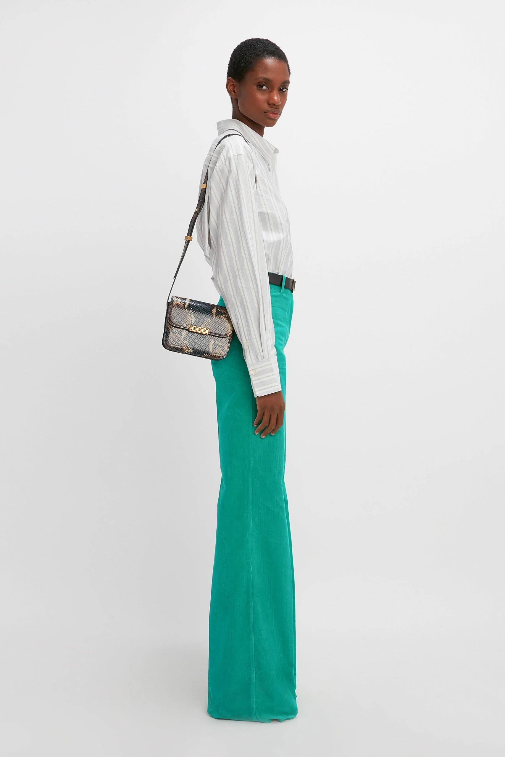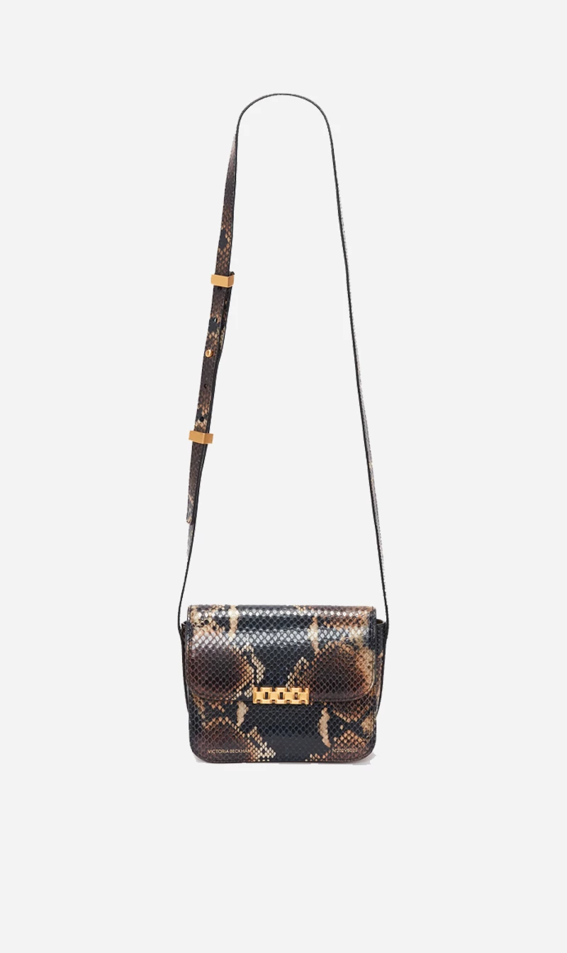 An evolution of Victoria Beckham’s best-selling Chain Pouch, the Mini Chain Shoulder Bag is designed to slip seamlessly into a modern woman’s wardrobe. In a navy-brown snake print – a key motif in the new season collection – it’s spacious enough to accommodate essentials, while the clean, uncomplicated lines lend versatility for everyday use.