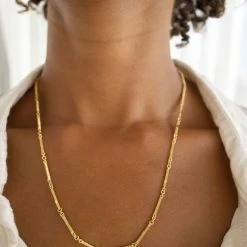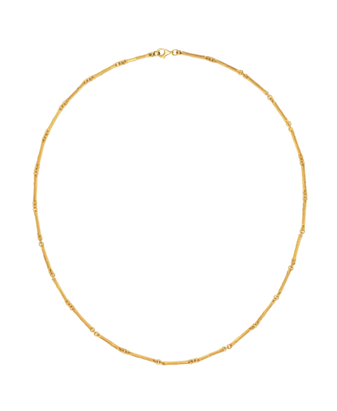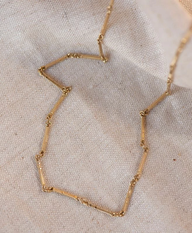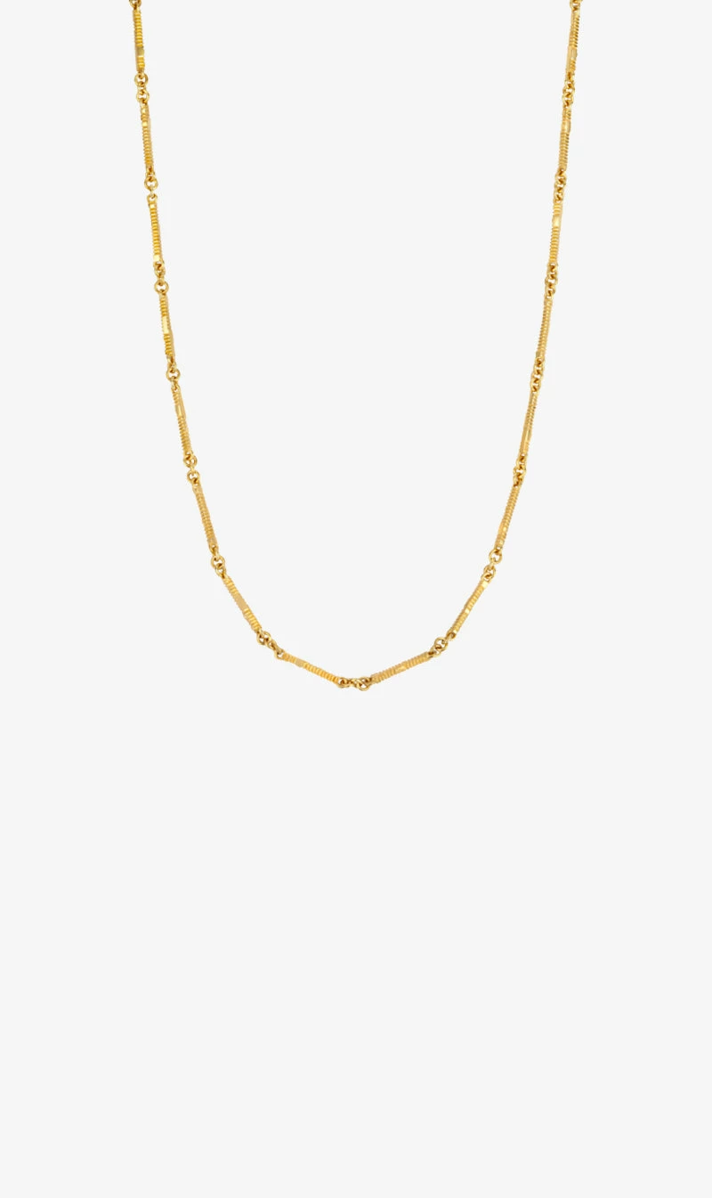 The Zoe & Morgan Ameena Chain (50cm), Gold Plated. Slightly 70s, slightly architectural, this hand crafted chain is made to layer. Each individual piece is joined with jump rings, giving it a fluid and fun movement.