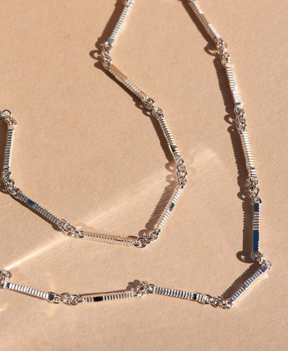 Zoe and Morgan bring us the Ameena Chain 40cm – Silver. A slightly 70s, slightly architectural, this hand crafted chain is made to layer. Each individual piece is joined with jump rings, giving it a fluid and fun movement.