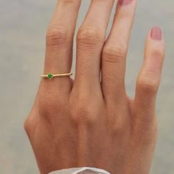 The Zoe & Morgan Anchored Stacker Ring in 22K Gold Plate / Chrome Diopside  Minimal and timeless, the softly textured thin band is anchored with a petite stone. Wear alone for simplicity with a pop of subtle colour, or pair with the Connected or Komodo stacker for a bolder look.