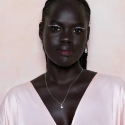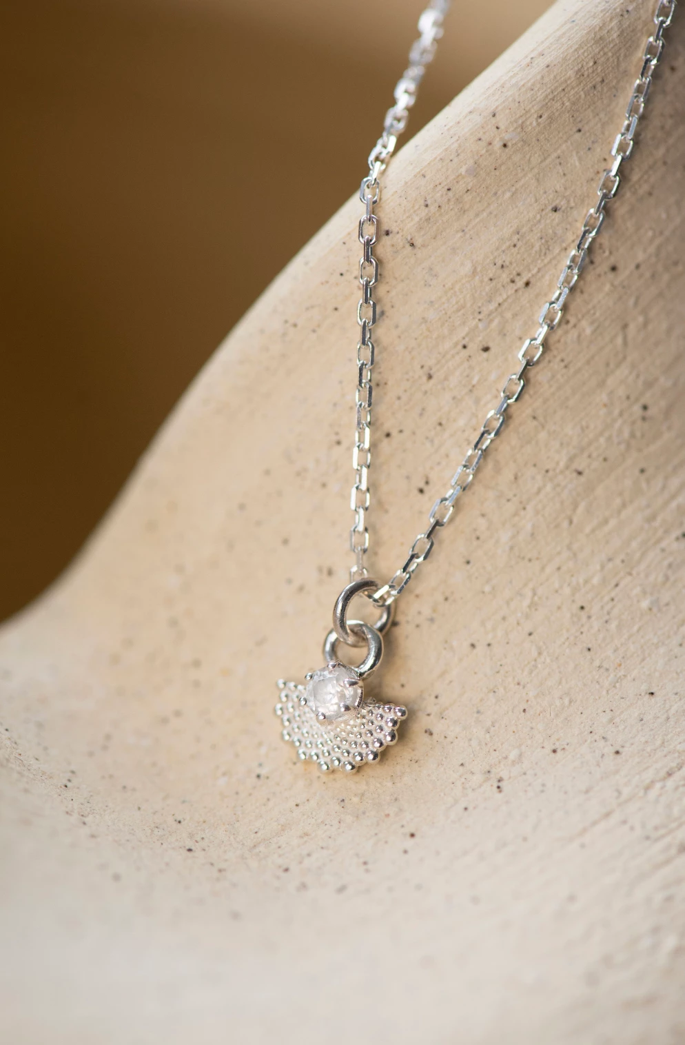 The Zoe And Morgan Eos Necklace in sterling silver with white zircon is inspired by the time in the morning when we first see daylight. The 40cm chain features a delicate stone in the centre which signifies the sun rising, with the texture inspired by the night sky melting into the soft hues of the morning.