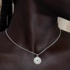 The Zoe And Morgan Helios Necklace in sterling silver with chrome diopside is inspired by the sun, powerful and bright, helios signifies the love for freedom and positivity. This beautifully textured pendant radiates from the central stone outwards like the sun.