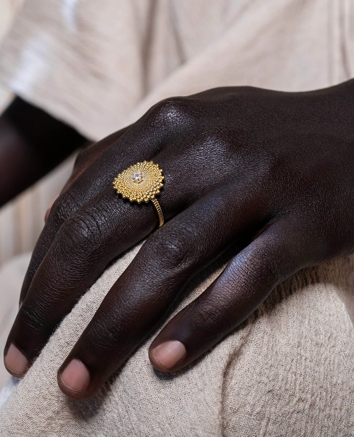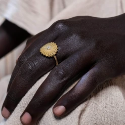 The Helios Ring from Zoe And Morgan is named after the god of the sun, powerful and bright – Helios signifies the love for freedom and positivity. This textured pendant radiates from the central stone outwards like the sun.