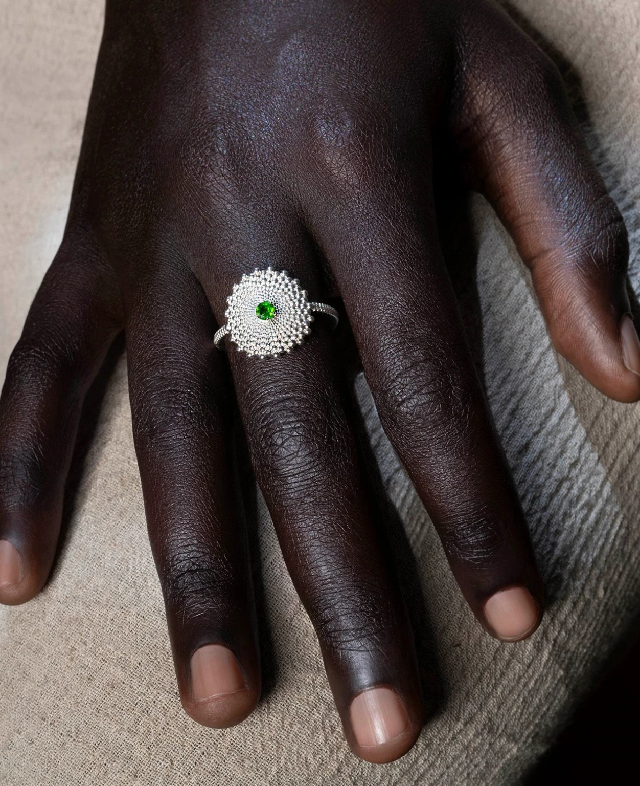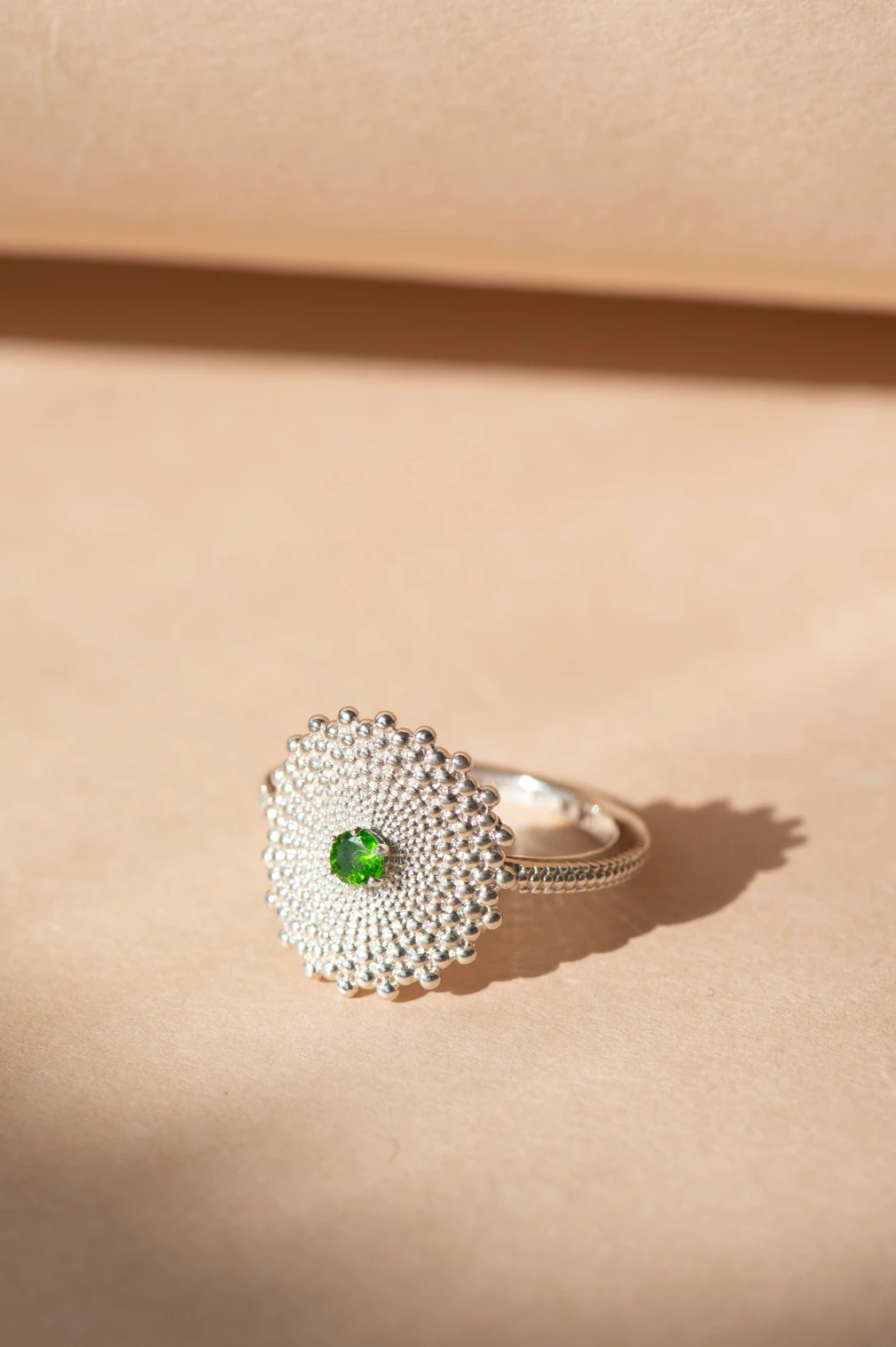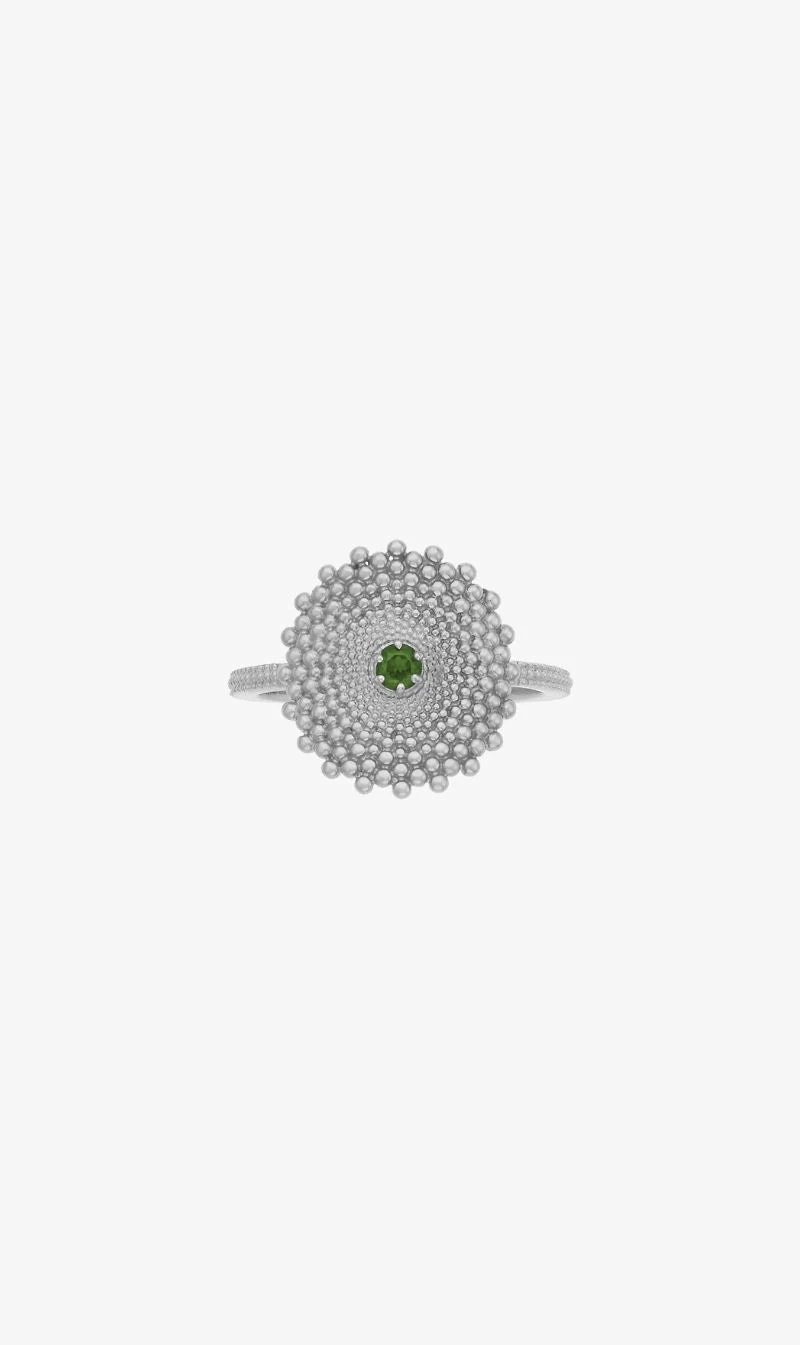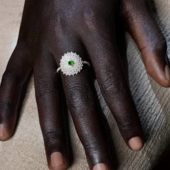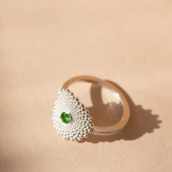 The Helios Ring from Zoe And Morgan is named after the god of the sun, powerful and bright – Helios signifies the love for freedom and positivity. This textured pendant radiates from the central stone outwards like the sun.