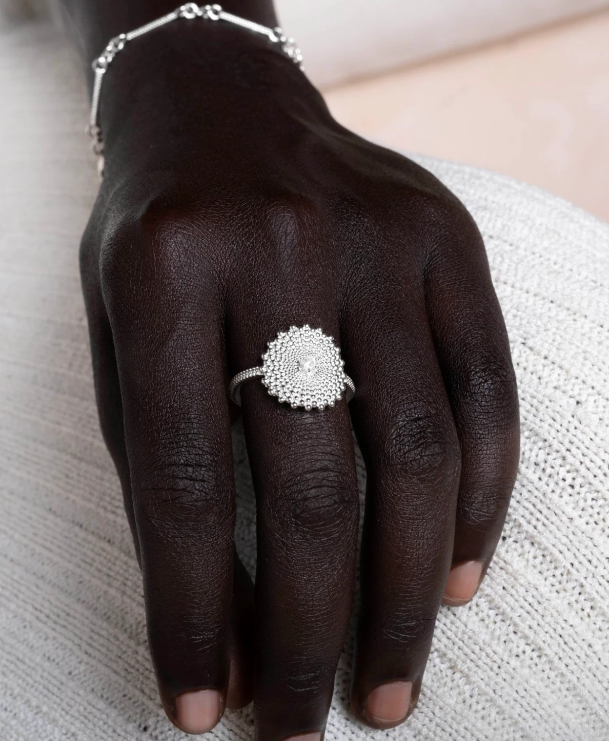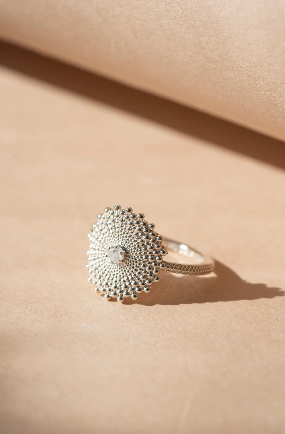 The Helios Ring from Zoe And Morgan is named after the god of the sun, powerful and bright – Helios signifies the love for freedom and positivity. This textured pendant radiates from the central stone outwards like the sun.