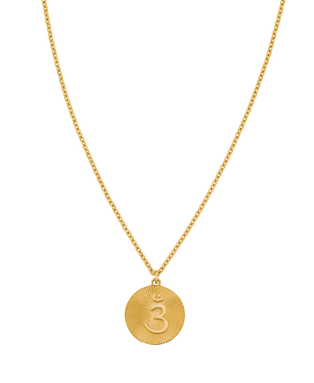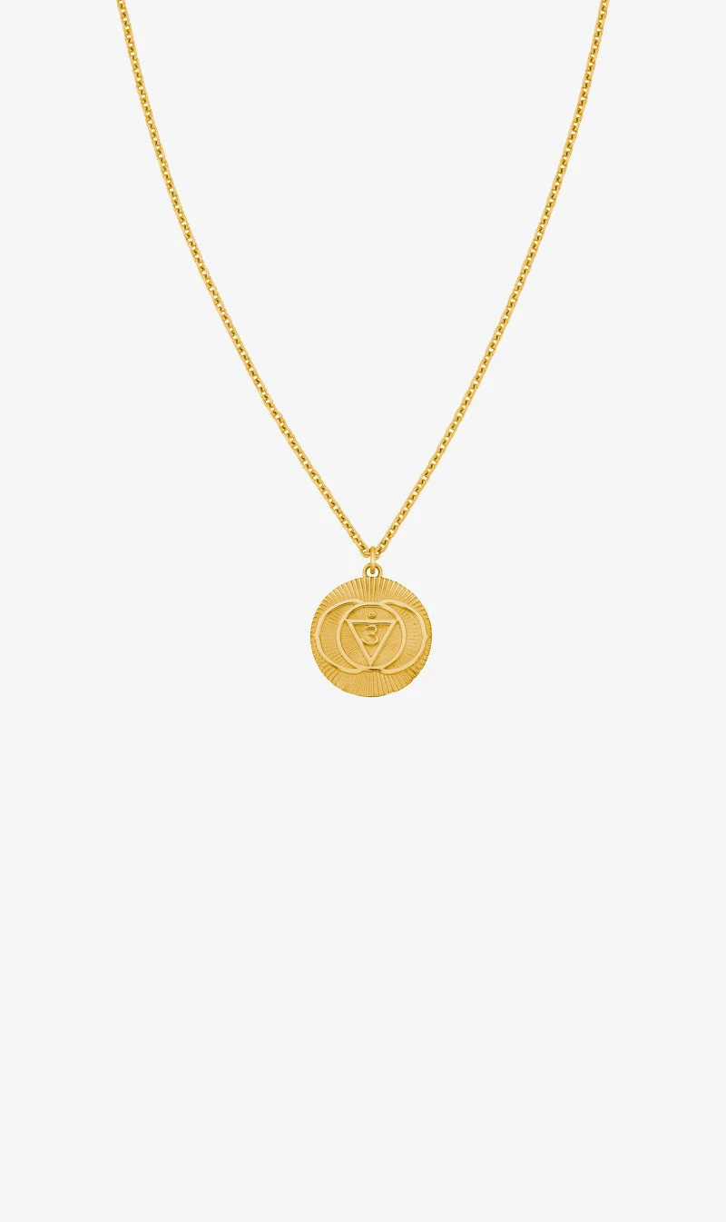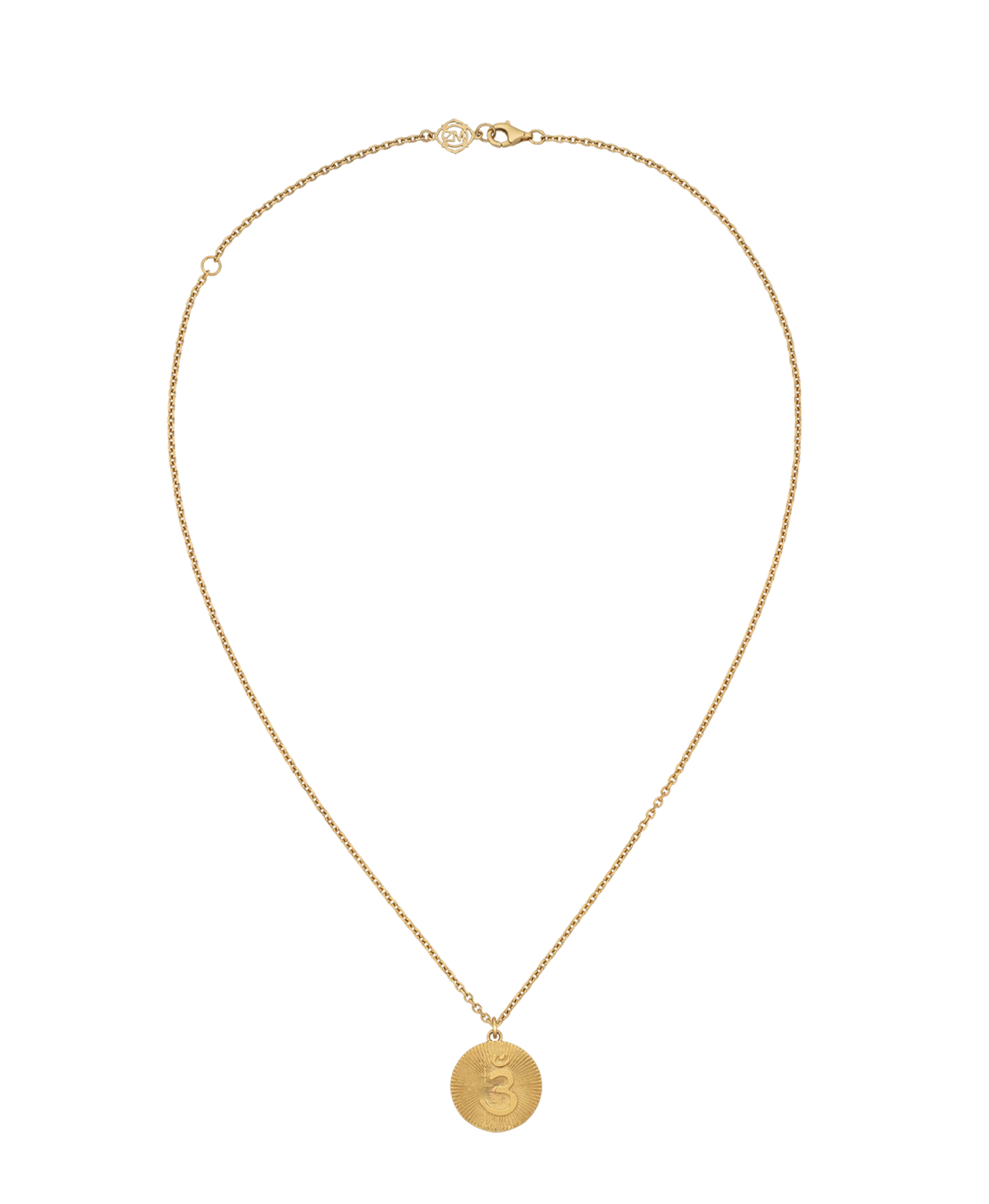 The Zoe & Morgan Intuition Ajna Necklace in 22K Gold Plate. Ajna sits between the eyebrows and is our center of intuition and foresight. When this chakra is open we unleash our innate wisdom, cutting through any illusions and allowing you to move forward with a clear picture. The pendant sits beautifully on your heart space, with the Sanskrit symbol on the back, giving you two ways to wear this necklace.