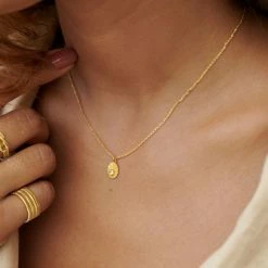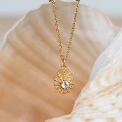 The Kina Necklace from Zoe & Morgan in Gold with a White Zirco Stone draws inspiration from the Kina; synonymous with walking along the shorelines, this necklace was made to reflect the shape and detailed textures of this urchin. The delicate drop pendant is centered with a petite Chrome Diopside stone, hanging gently to allow for natural movement.