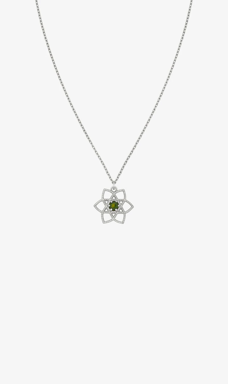 The Zoe & Morgan Padma Lotus Heart Necklace in 925 Sterling Silver / Chrome Diopside. The Padma (Lotus) blooms above the water’s surface, rising above and representing daily hope. Symbolising that each day is a new day with endless opportunities. At the centre of the Lotus is a deep Chrome Diopside stone, said to expand love on every level and open your heart chakra.