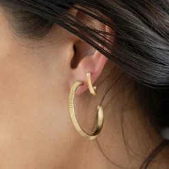 In the 60’s, figures such as Yves Saint Laurent, Mick Jagger and Talitha Getty would escape to Morocco. With the landscapes of this place seeming as if they have been sculpted by an endless imagination, it is easy to see how they would come here to be inspired – just as we were. The Tasa earring pays homage to the glamour of these individuals in this time and place. With a pointed surface and textured front, this hoop gently curves around the ear and is a bigger, bolder option to our Isa earring.